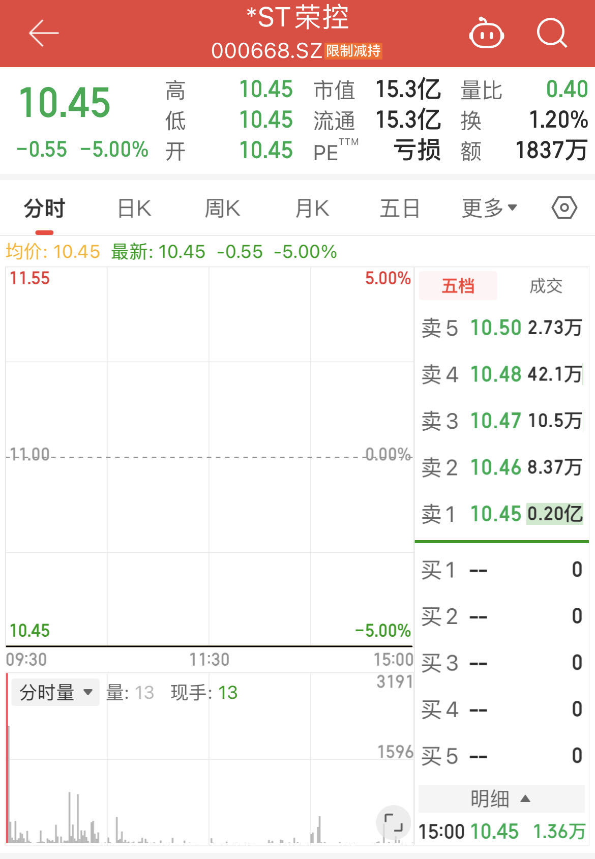 10月27日,*ST荣控(即荣丰控股,000668.SZ)开盘即封死跌停,报收10.45元/股,封单金额近2000万元。这一走势与公司前一日发布的三季报形成鲜明对比:前三季度营收同比激增377.55%至1.85亿元,净亏损收窄20.18%。