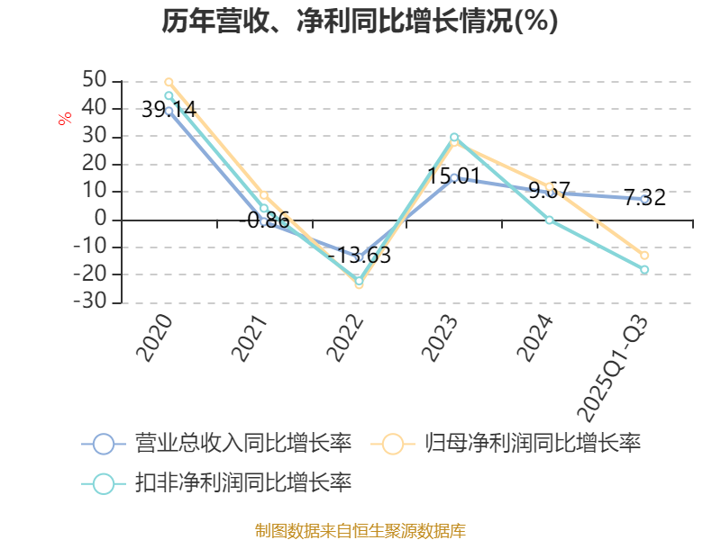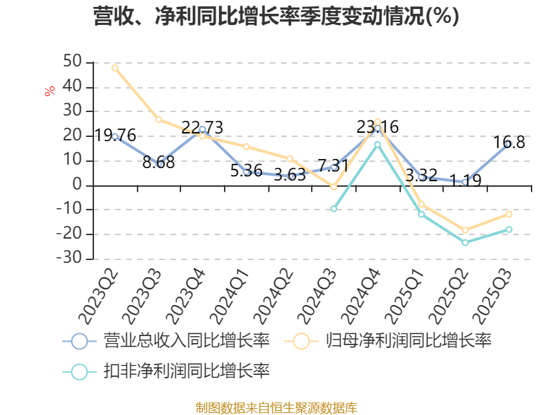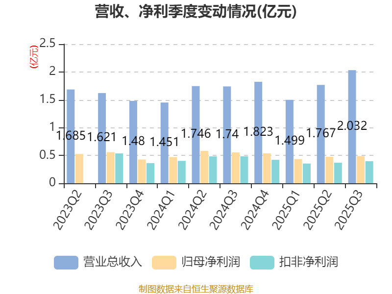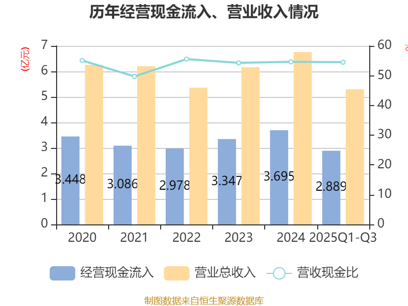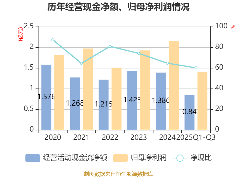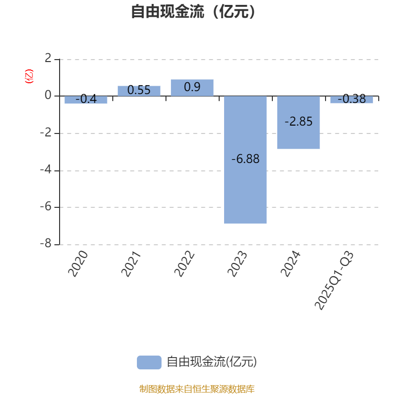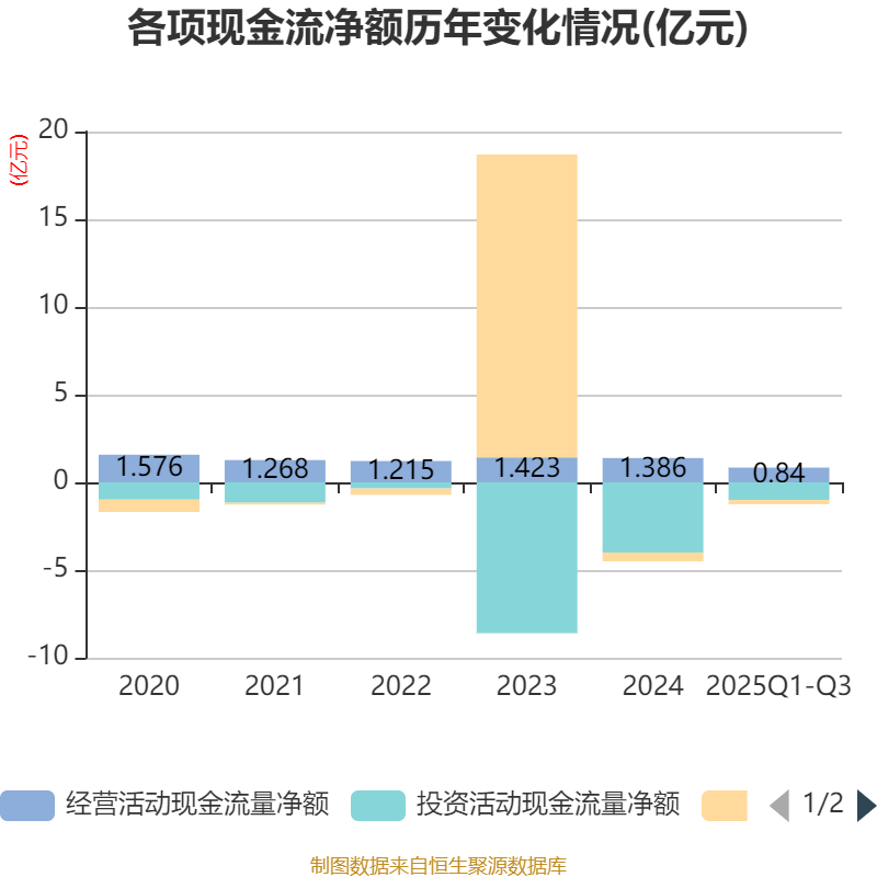 2025年前三季度,公司经营活动现金流净额为8404.78万元,同比增长51.88%;筹资活动现金流净额-2433.29万元,同比增加1712.4万元;投资活动现金流净额-1亿元,上年同期为-8336.98万元。