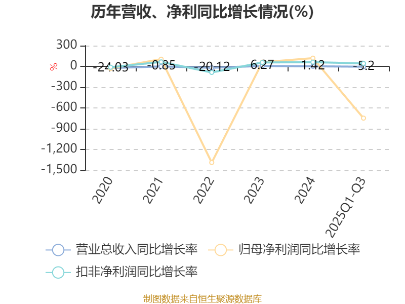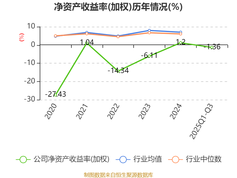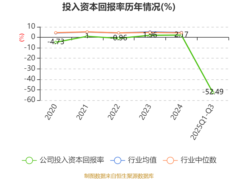 盈利能力方面, 2025年前三季度公司加权平均净资产收益率为-1.36%,同比下降1.2个百分点。公司2025年前三季度投入资本回报率为-52.49%,较上年同期下降53.39个百分点。
