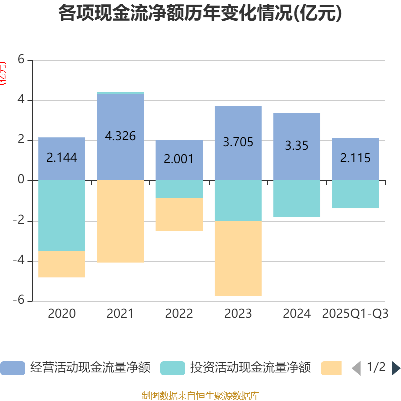 2025年前三季度,公司经营活动现金流净额为2.11亿元,同比增长5.39%;筹资活动现金流净额-119.7万元,同比减少1.98亿元;投资活动现金流净额-1.36亿元,上年同期为-1.29亿元。