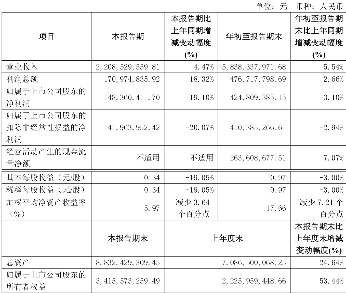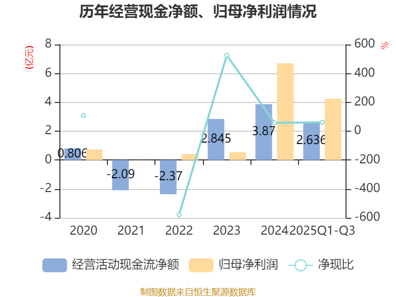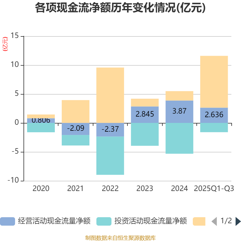 2025年前三季度,公司经营活动现金流净额为2.64亿元,同比增长7.07%;筹资活动现金流净额8.96亿元,同比增加6.45亿元;投资活动现金流净额-1.6亿元,上年同期为-3.68亿元。