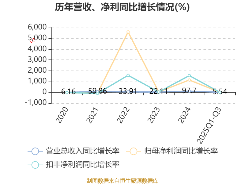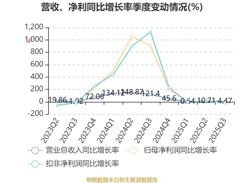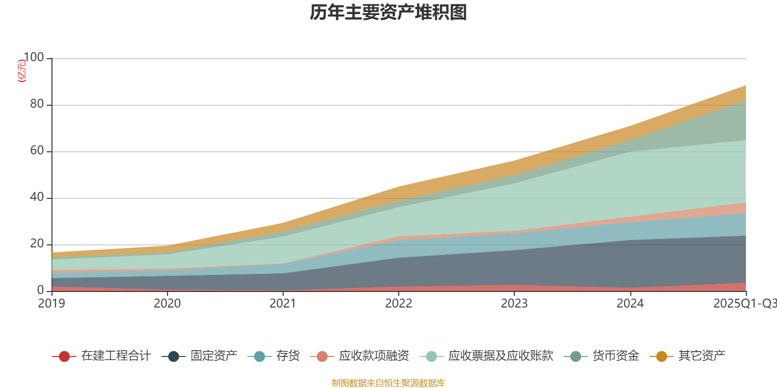 资产重大变化方面,截至2025年三季度末,公司货币资金较上年末增加242.72%,占公司总资产比重上升12.26个百分点;应收票据及应收账款较上年末减少4.09%,占公司总资产比重下降9.08个百分点;固定资产较上年末减少1.31%,占公司总资产比重下降6.02个百分点;在建工程合计较上年末增加159.66%,占公司总资产比重上升2.08个百分点。