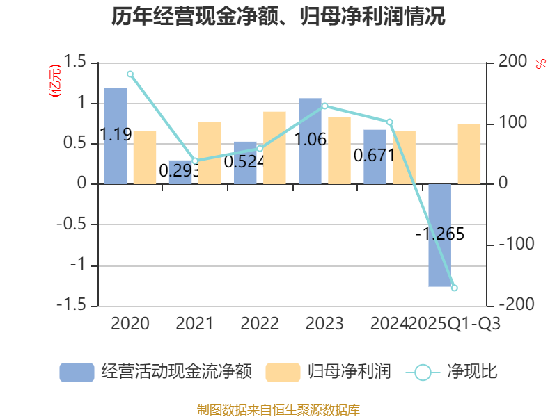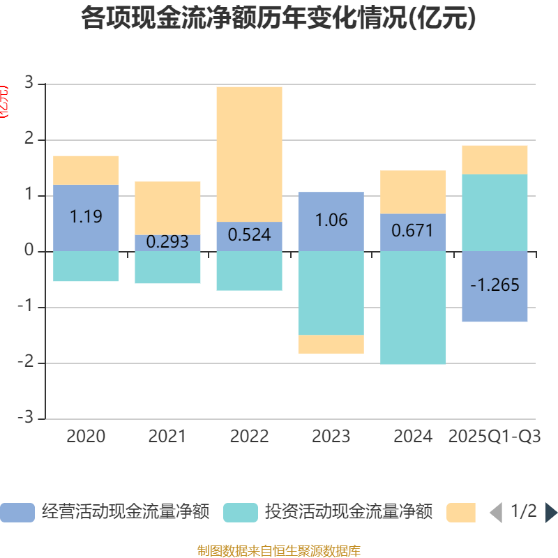 2025年前三季度,公司经营活动现金流净额为-1.26亿元,同比减少9488.88万元;筹资活动现金流净额5141.32万元,同比增加1587.04万元;投资活动现金流净额1.38亿元,上年同期为-1.56亿元。