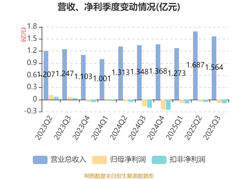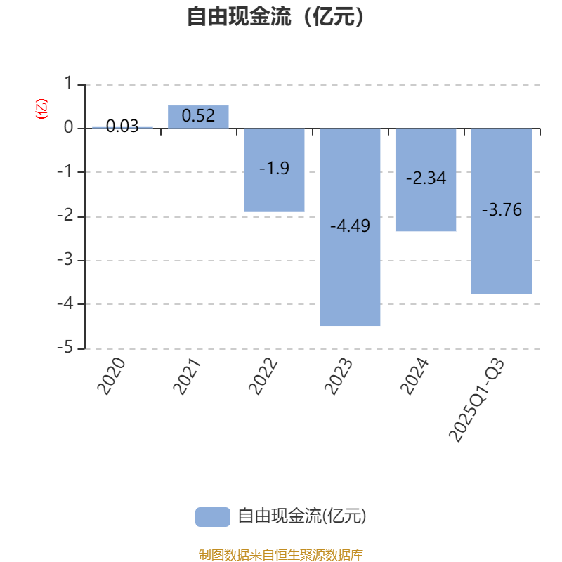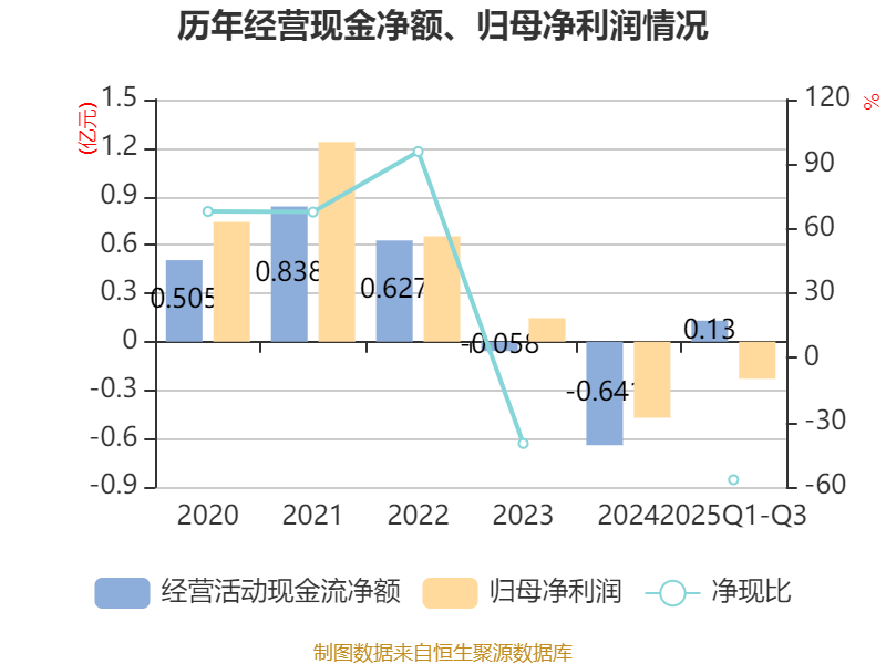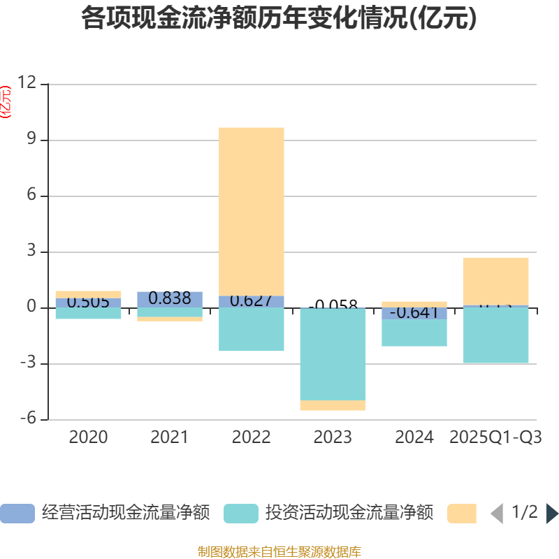 2025年前三季度,公司经营活动现金流净额为1300.25万元,同比增加5650.23万元;筹资活动现金流净额2.54亿元,同比增加2.88亿元;投资活动现金流净额-2.98亿元,上年同期为-6762.4万元。