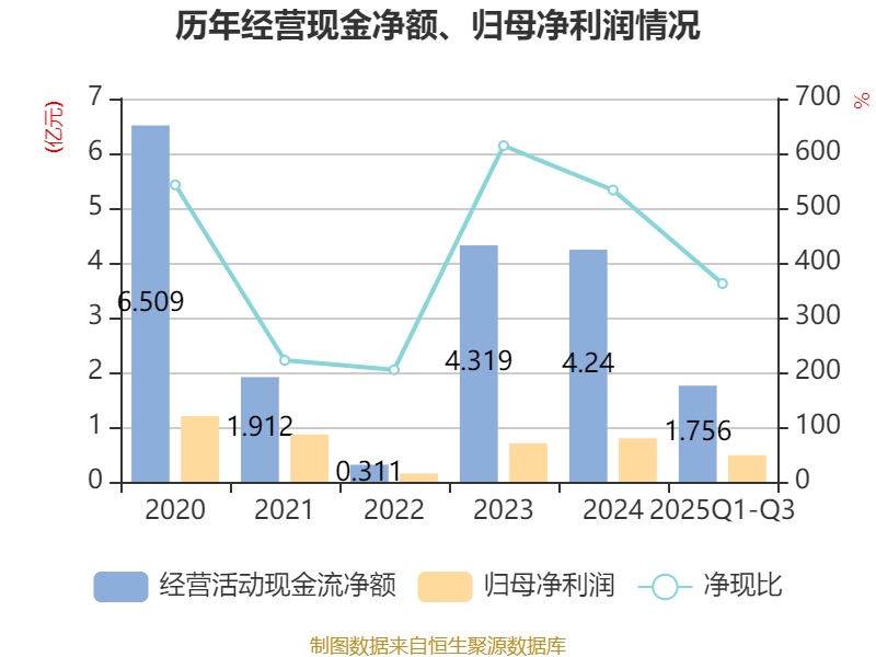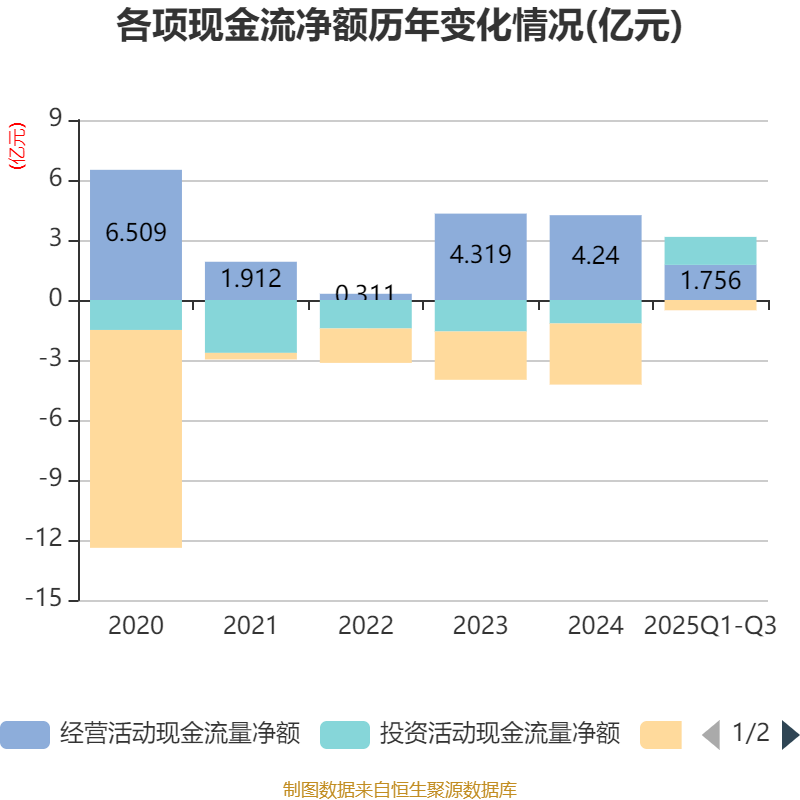 2025年前三季度,公司经营活动现金流净额为1.76亿元,同比增长4.68%;筹资活动现金流净额-5138.57万元,同比减少1328.3万元;投资活动现金流净额1.4亿元,上年同期为-2.34亿元。