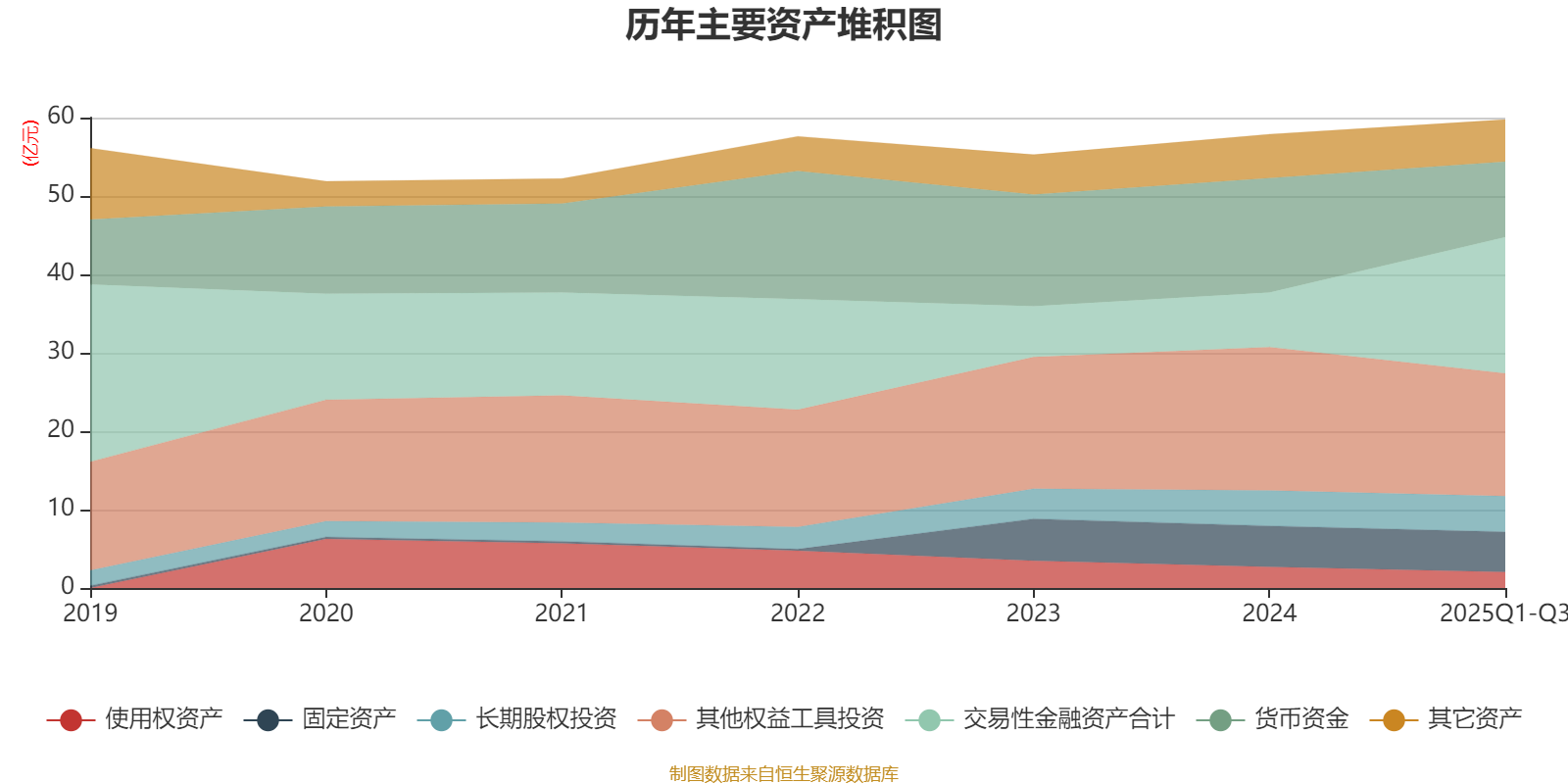 资产重大变化方面,截至2025年三季度末,公司交易性金融资产合计较上年末增加149.15%,占公司总资产比重上升17.04个百分点;货币资金较上年末减少33.94%,占公司总资产比重下降9.07个百分点;其他权益工具投资较上年末减少14.39%,占公司总资产比重下降5.39个百分点;使用权资产较上年末减少24.41%,占公司总资产比重下降1.24个百分点。