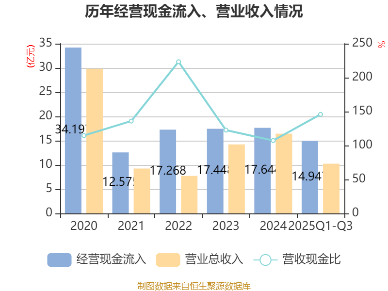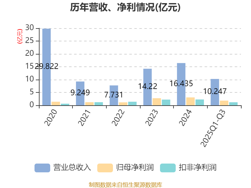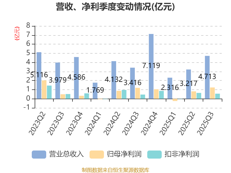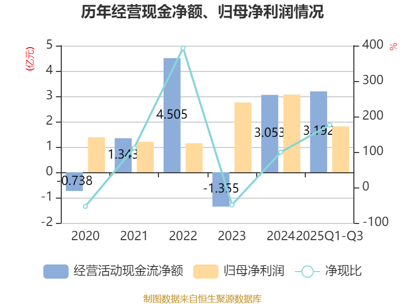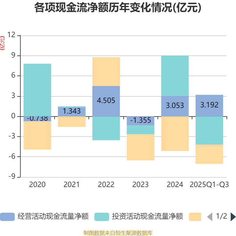 2025年前三季度,公司经营活动现金流净额为3.19亿元,同比增长62.01%;筹资活动现金流净额-2.85亿元,同比增加1.5亿元;投资活动现金流净额-4.19亿元,上年同期为-1.43亿元。