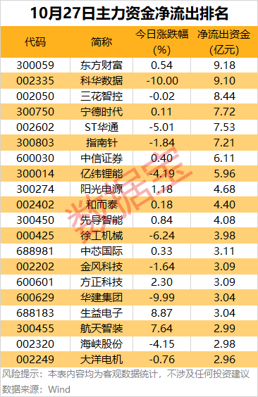 今日有40股主力资金净流出均超2亿元,其中,东方财富、科华数据、三花智控、宁德时代、ST华通、指南针净流出金额均超7亿元。