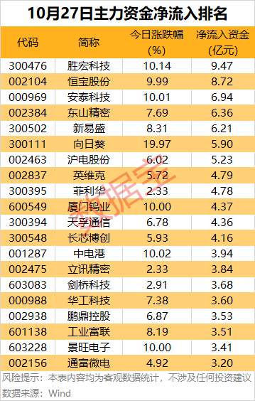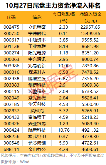 个股方面,立讯精密、宁德时代尾盘主力资金净流入均超1.5亿元。中油资本、工业富联、阳光电源、中兴通讯尾盘获主力资金抢筹均超8000万元。