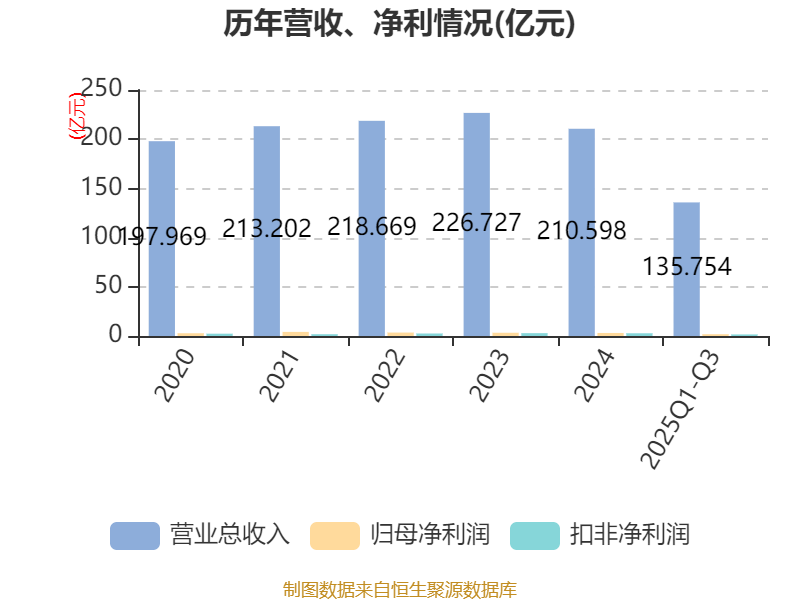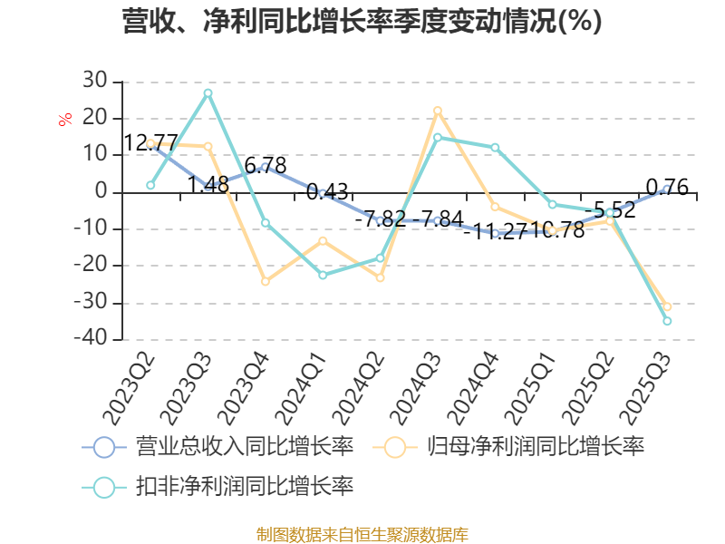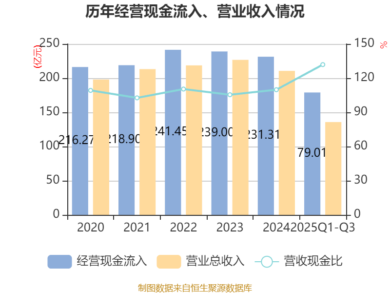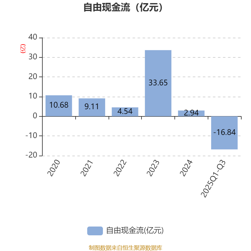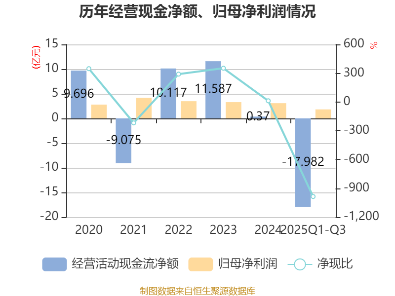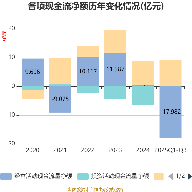 2025年前三季度,公司经营活动现金流净额为-17.98亿元,同比减少2168.78万元;筹资活动现金流净额8.99亿元,同比减少1.27亿元;投资活动现金流净额421.4万元,上年同期为-1.86亿元。