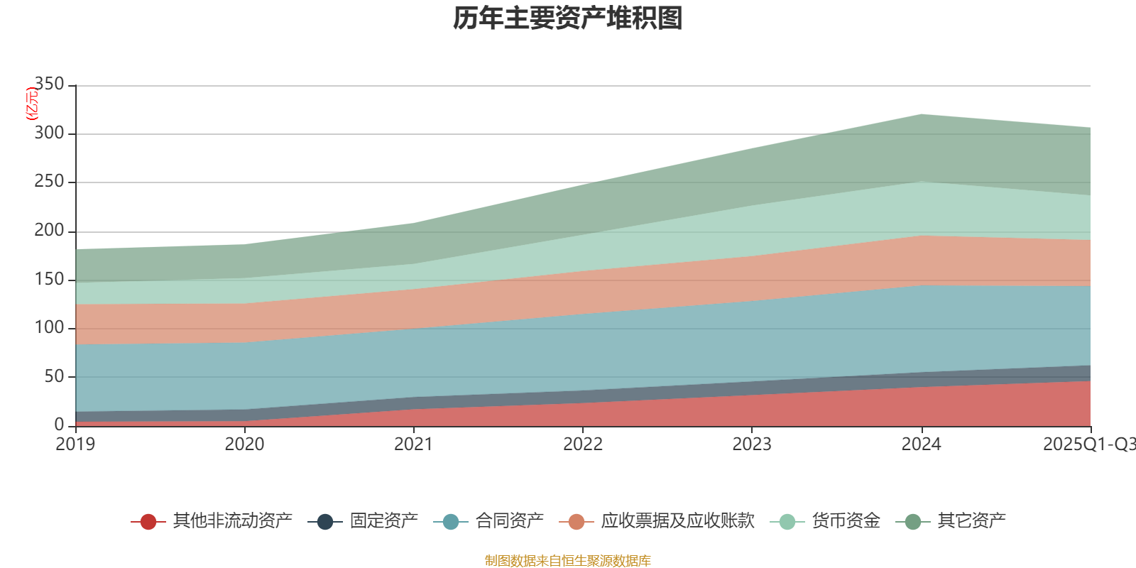 资产重大变化方面,截至2025年三季度末,公司其他非流动资产较上年末增加15.42%,占公司总资产比重上升2.57个百分点;货币资金较上年末减少17.36%,占公司总资产比重下降2.36个百分点;合同资产较上年末减少8.91%,占公司总资产比重下降1.34个百分点;应收票据及应收账款较上年末减少7.58%,占公司总资产比重下降0.55个百分点。