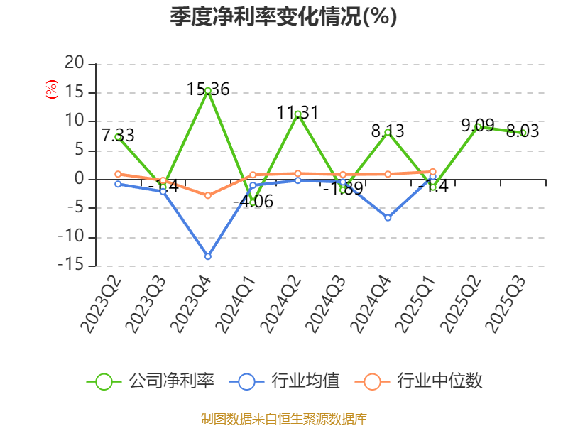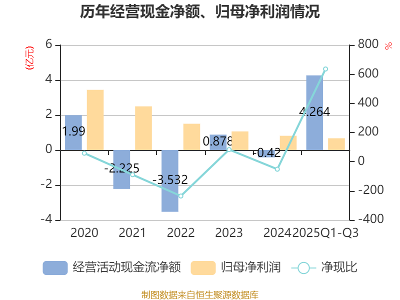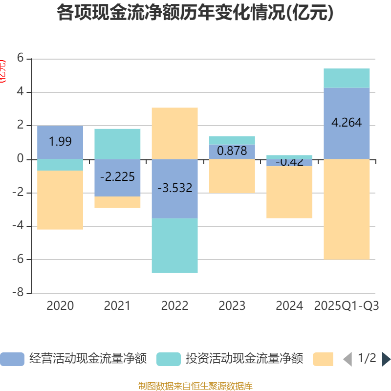 2025年前三季度,公司经营活动现金流净额为4.26亿元,同比增加4.28亿元;筹资活动现金流净额-5.99亿元,同比减少3.01亿元;投资活动现金流净额1.15亿元,上年同期为-566.22万元。
