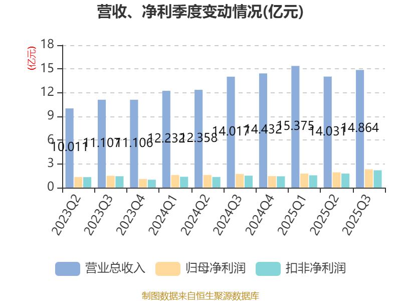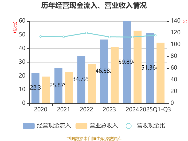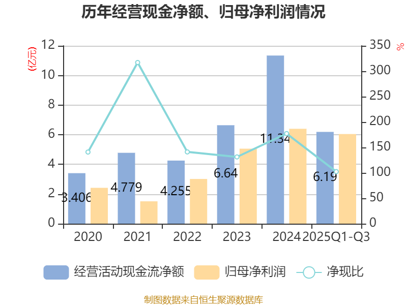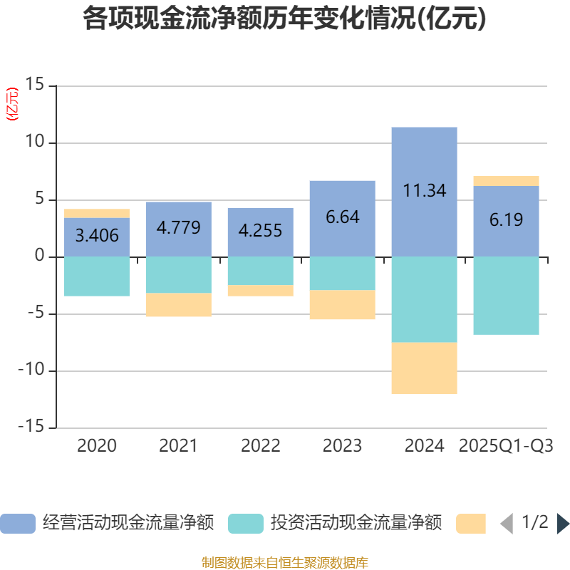 2025年前三季度,公司经营活动现金流净额为6.19亿元,同比下降29.79%;筹资活动现金流净额8729.77万元,同比增加5.62亿元;投资活动现金流净额-6.87亿元,上年同期为-4.46亿元。