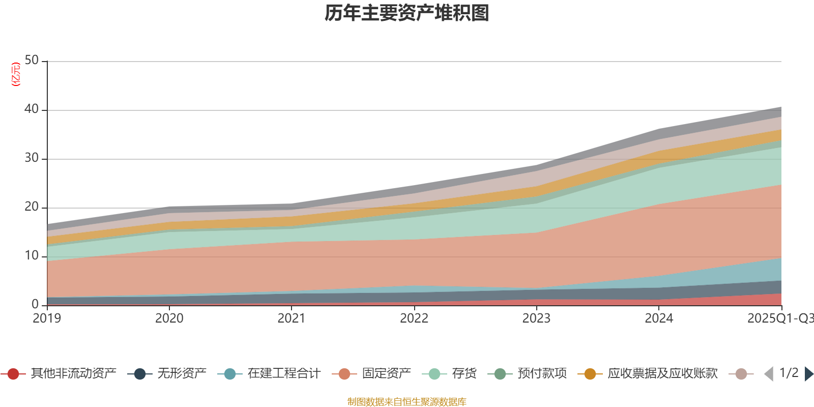 资产重大变化方面,截至2025年三季度末,公司在建工程合计较上年末增加89.57%,占公司总资产比重上升4.59个百分点;固定资产较上年末增加2.44%,占公司总资产比重下降3.63个百分点;其他非流动资产较上年末增加109.31%,占公司总资产比重上升2.74个百分点;应收票据及应收账款较上年末减少15.2%,占公司总资产比重下降1.79个百分点。