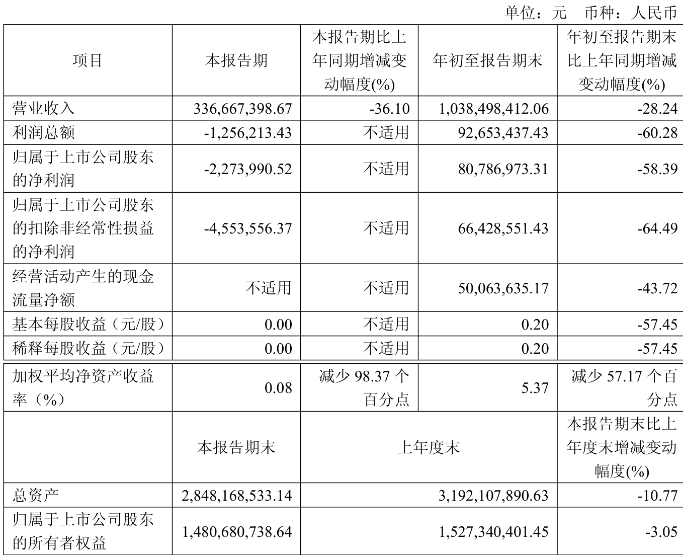 中证智能财讯贵州三力(603439)10月28日披露2025年第三季度报告。前三季度公司实现营业总收入10.38亿元,同比下降28.24%;归母净利润8078.7万元,同比下降58.39%;扣非净利润6642.86万元,同比下降64.49%;经营活动产生的现金流量净额为5006.36万元,同比下降43.72%;报告期内,贵州三力基本每股收益为0.2元,加权平均净资产收益率为5.37%。