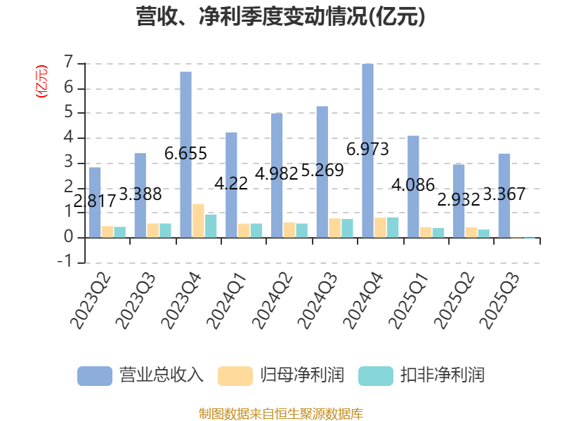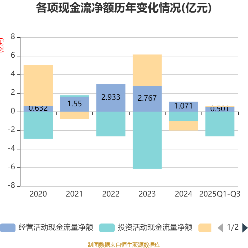 2025年前三季度,公司经营活动现金流净额为5006.36万元,同比下降43.72%;筹资活动现金流净额727.32万元,同比增加6302.66万元;投资活动现金流净额-2.66亿元,上年同期为-6728.27万元。