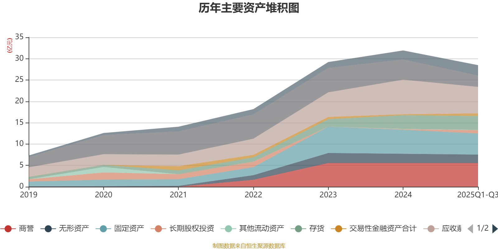资产重大变化方面,截至2025年三季度末,公司货币资金较上年末减少44.05%,占公司总资产比重下降5.55个百分点;应收票据及应收账款较上年末减少23.4%,占公司总资产比重下降3.59个百分点;长期股权投资较上年末增加534.16%,占公司总资产比重上升2.4个百分点;商誉较上年末没有变化,占公司总资产比重上升2.1个百分点。