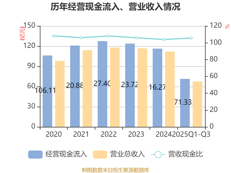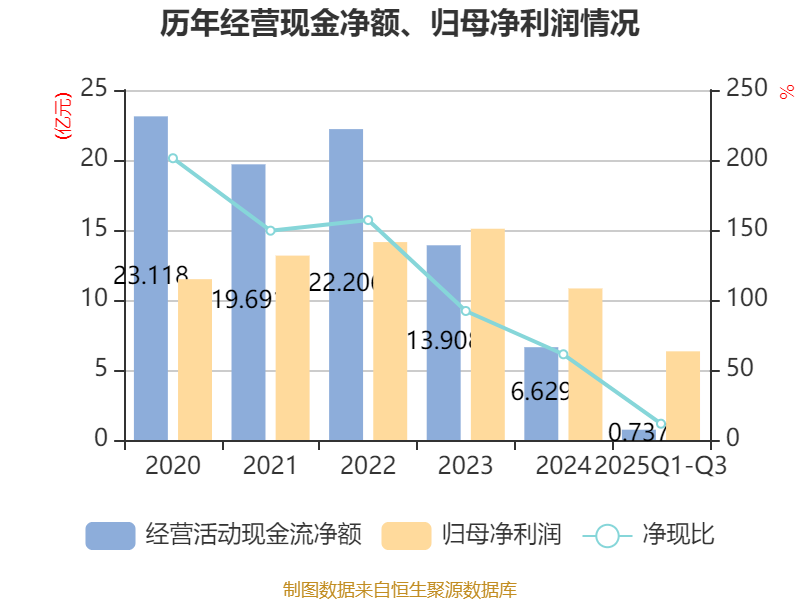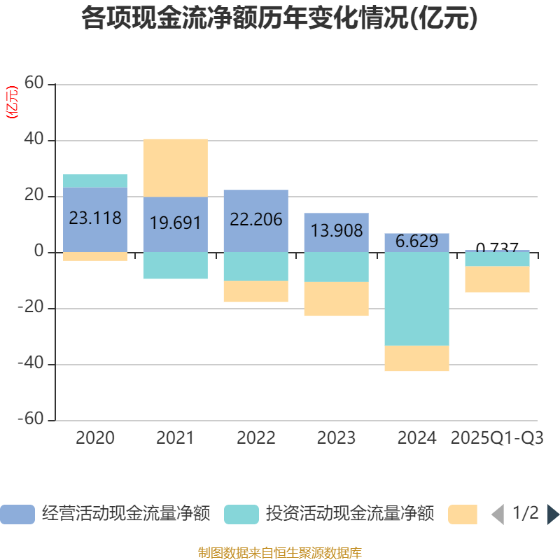 2025年前三季度,公司经营活动现金流净额为7368.41万元,同比增加1.25亿元;筹资活动现金流净额-9.25亿元,同比减少3179.19万元;投资活动现金流净额-5.14亿元,上年同期为-34.03亿元。