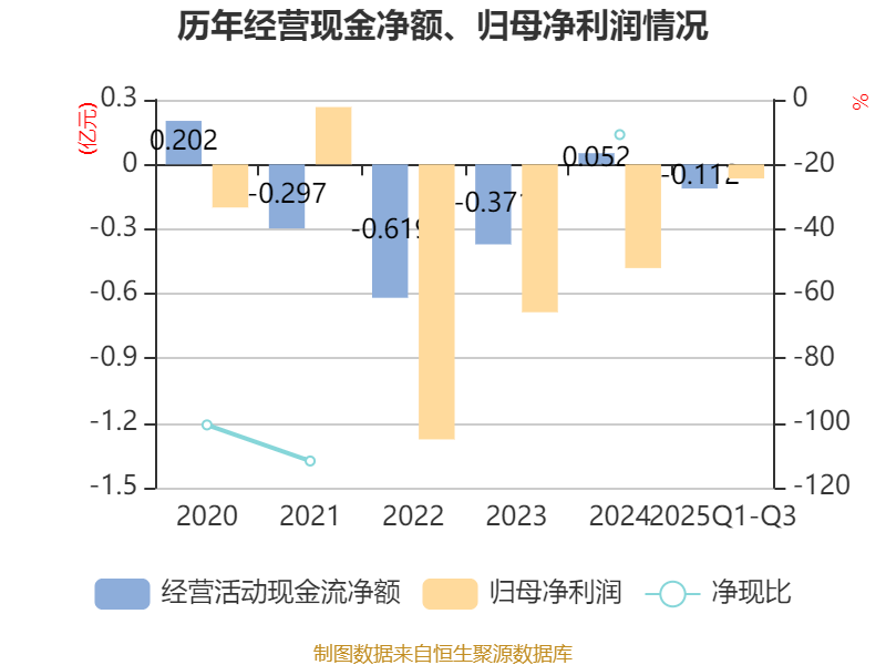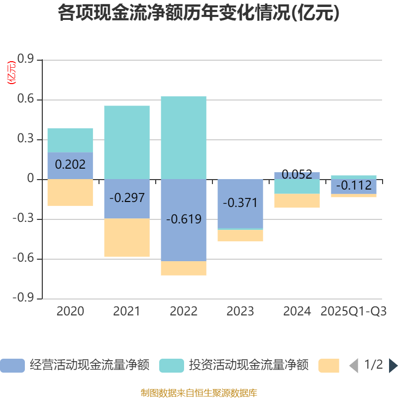 2025年前三季度,公司经营活动现金流净额为-1117.73万元,同比增加310.12万元;筹资活动现金流净额-240万元,同比增加82.73万元;投资活动现金流净额282.91万元,上年同期为-21.5万元。