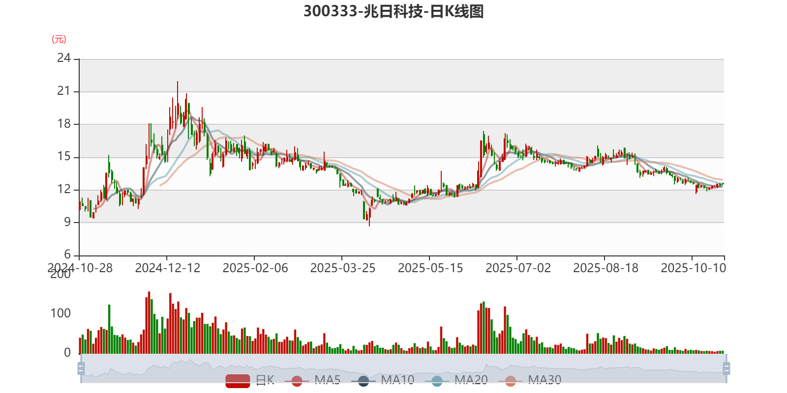 中证智能财讯兆日科技(300333)10月28日披露2025年第三季度报告。前三季度公司实现营业总收入9997.32万元,同比下降8.49%;归母净利润亏损645.86万元,上年同期亏损321.54万元;扣非净利润亏损793.19万元,上年同期亏损347.62万元;经营活动产生的现金流量净额为-1117.73万元,上年同期为-1427.85万元;报告期内,兆日科技基本每股收益为-0.0192元,加权平均净资产收益率为-1.11%。