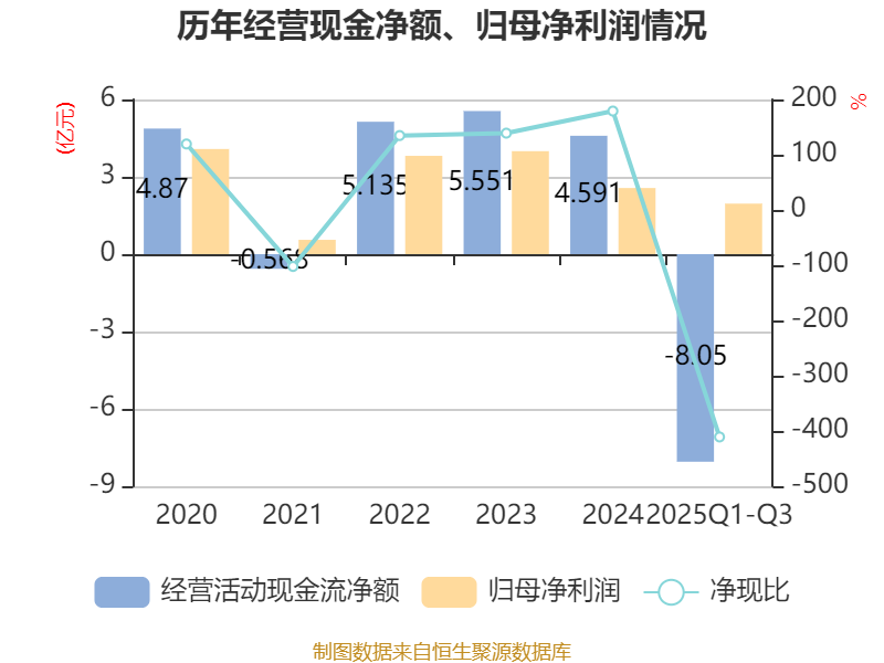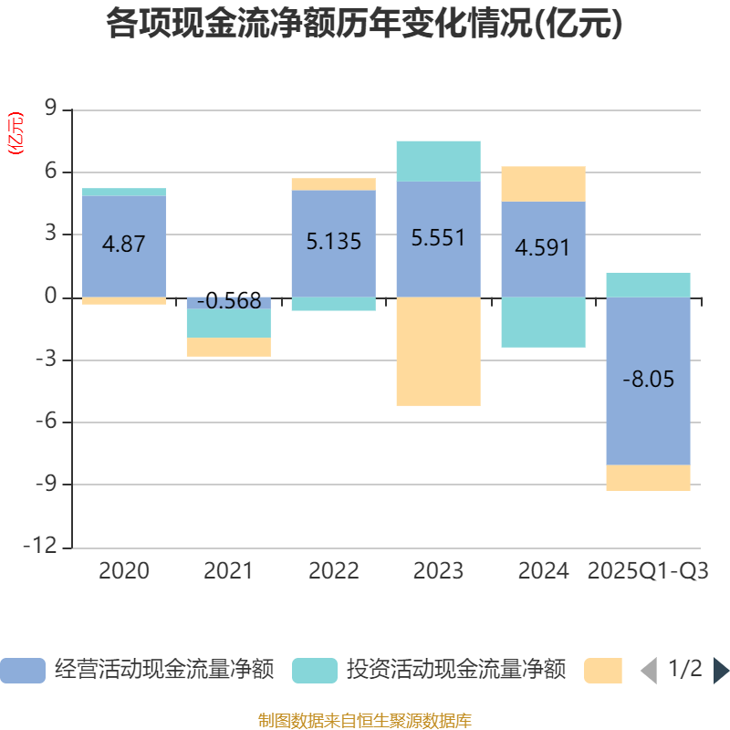 2025年前三季度,公司经营活动现金流净额为-8.05亿元,同比减少3.59亿元;筹资活动现金流净额-1.24亿元,同比减少1.56亿元;投资活动现金流净额1.17亿元,上年同期为-9766.44万元。