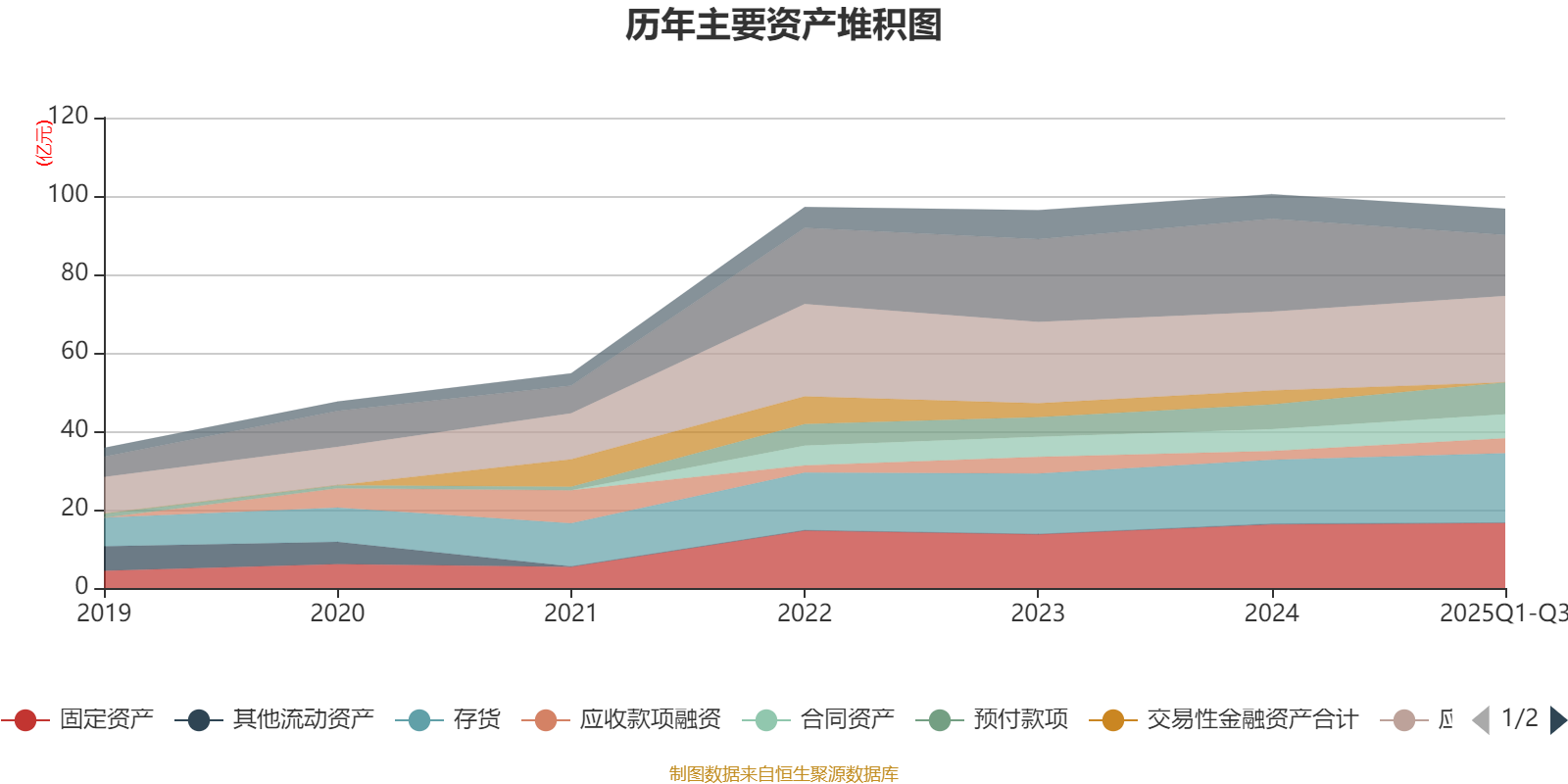 资产重大变化方面,截至2025年三季度末,公司货币资金较上年末减少34.28%,占公司总资产比重下降7.49个百分点;交易性金融资产合计较上年末减少100%,占公司总资产比重下降3.53个百分点;应收票据及应收账款较上年末增加9.81%,占公司总资产比重上升2.8个百分点;预付款项较上年末增加29.01%,占公司总资产比重上升2.13个百分点。