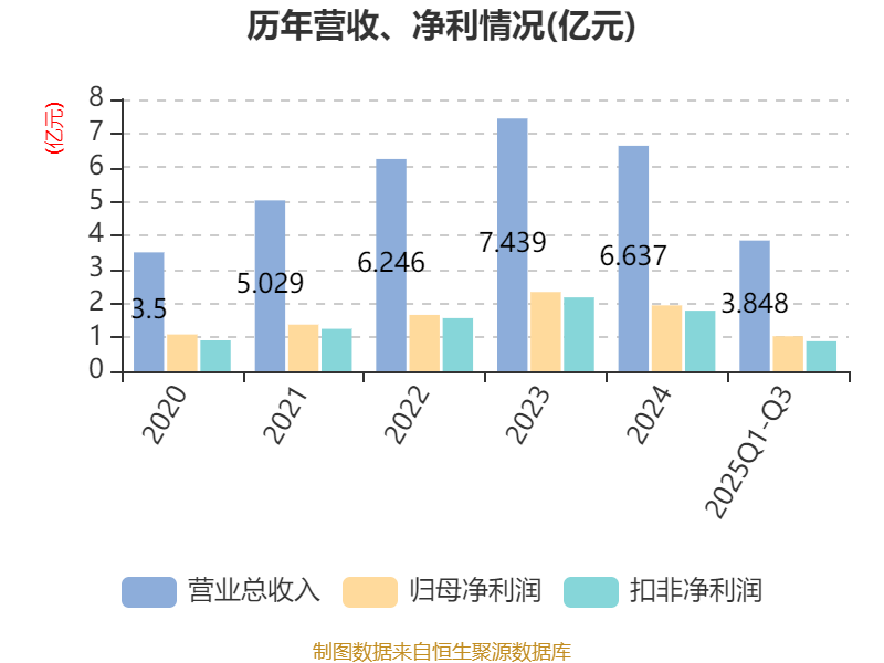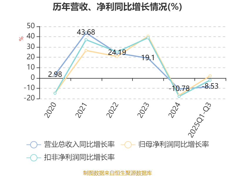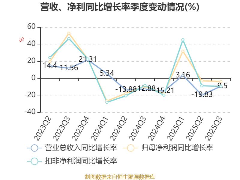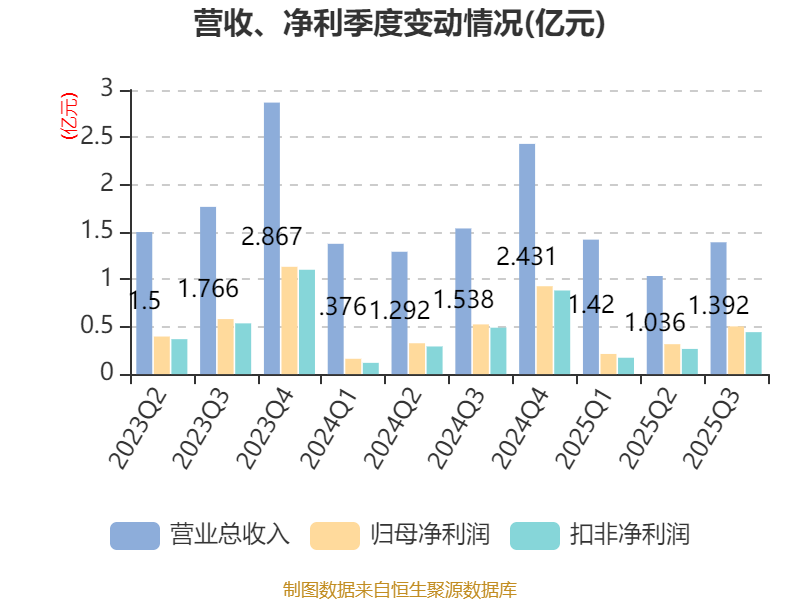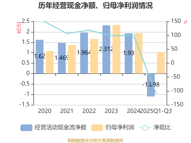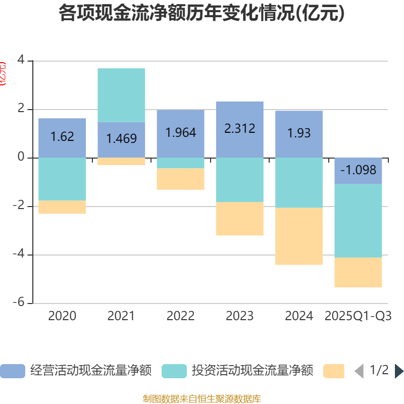 2025年前三季度,公司经营活动现金流净额为-1.1亿元,同比增加1480.96万元;筹资活动现金流净额-1.23亿元,同比增加6560.59万元;投资活动现金流净额-3.03亿元,上年同期为-1.83亿元。