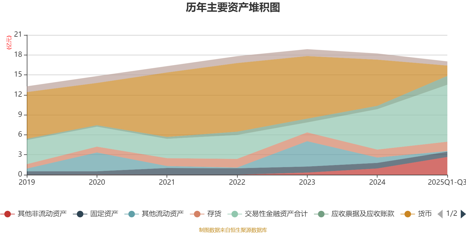 资产重大变化方面,截至2025年三季度末,公司货币资金较上年末减少77.63%,占公司总资产比重下降28.96个百分点;交易性金融资产合计较上年末增加40.82%,占公司总资产比重上升16.9个百分点;其他非流动资产较上年末增加182.86%,占公司总资产比重上升10.52个百分点;应收票据及应收账款较上年末增加163.98%,占公司总资产比重上升5.04个百分点。
