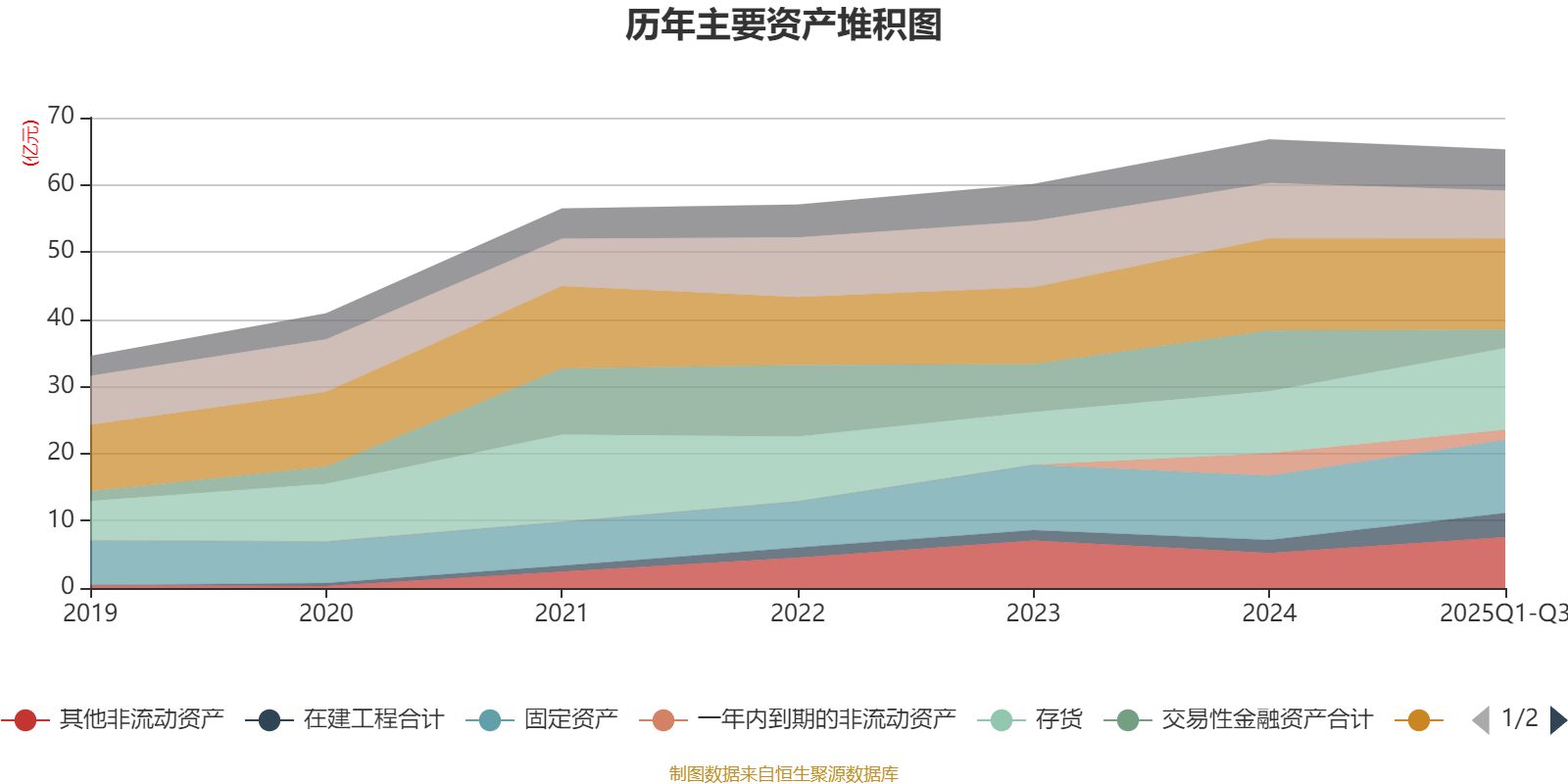 资产重大变化方面,截至2025年三季度末,公司交易性金融资产合计较上年末减少69.39%,占公司总资产比重下降9.3个百分点;存货较上年末增加31.84%,占公司总资产比重上升4.81个百分点;其他非流动资产较上年末增加45%,占公司总资产比重上升3.79个百分点;一年内到期的非流动资产较上年末减少55.04%,占公司总资产比重下降2.71个百分点。