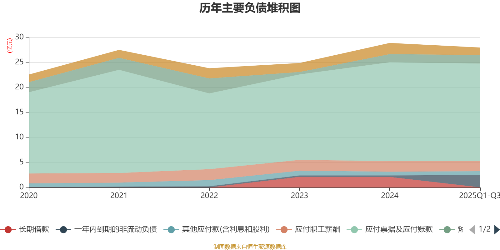 负债重大变化方面,截至2025年三季度末,公司一年内到期的非流动负债较上年末增加732.8%,占公司总资产比重上升3.31个百分点;长期借款较上年末减少98.58%,占公司总资产比重下降3.12个百分点;预计负债较上年末减少45.08%,占公司总资产比重下降0.3个百分点;应付票据及应付账款较上年末减少1.28%,占公司总资产比重上升0.29个百分点。