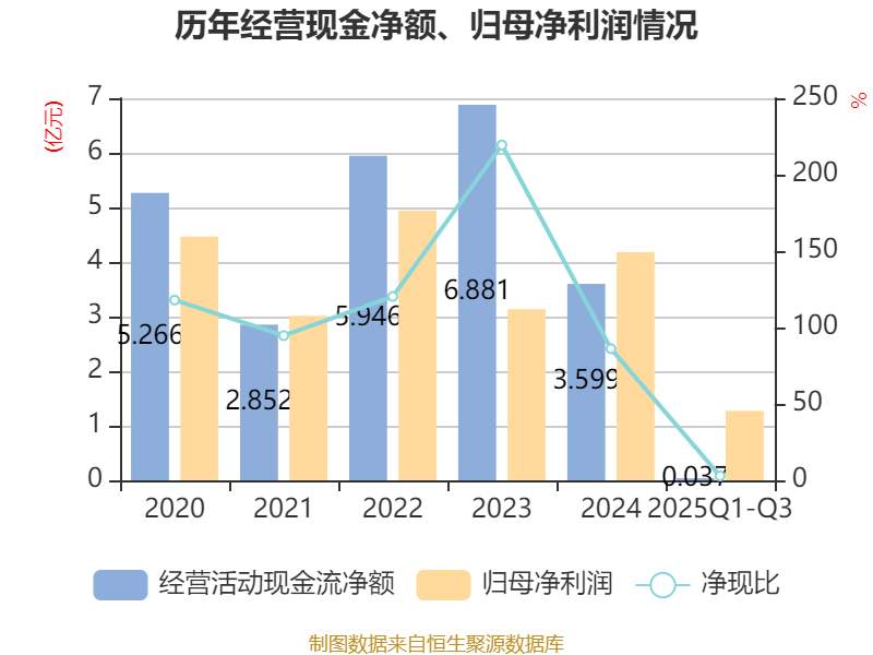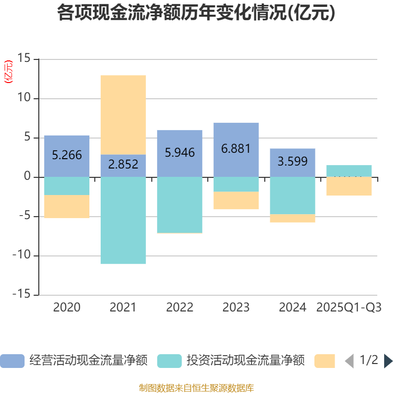 2025年前三季度,公司经营活动现金流净额为366.53万元,同比下降96.16%;筹资活动现金流净额-2.38亿元,同比减少1.93亿元;投资活动现金流净额1.45亿元,上年同期为-4.56亿元。