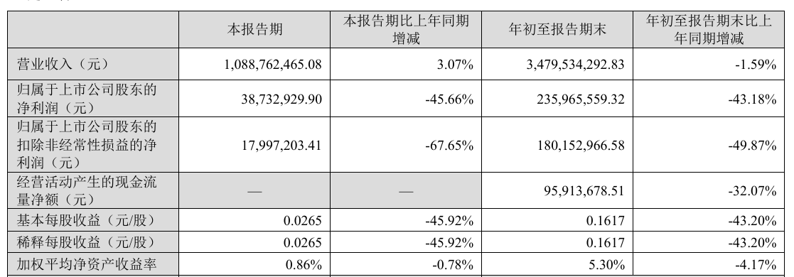 10月27日晚间,报喜鸟(深市代码:002154)发布2025年三季度报告。财报显示,该公司前三季度实现营收约34.8亿元,同比减少1.59%;归属于上市公司股东的净利润约2.36亿元,同比下降43.18%。