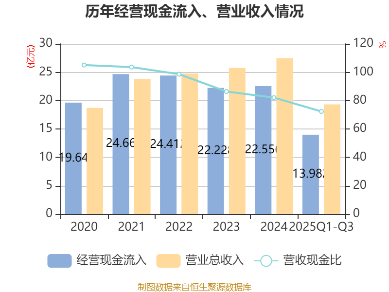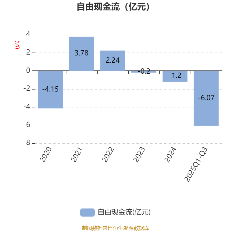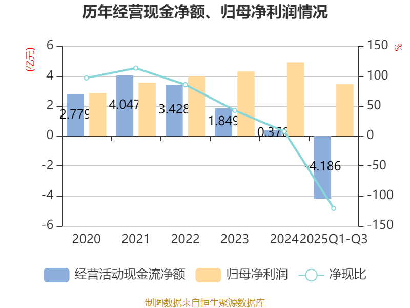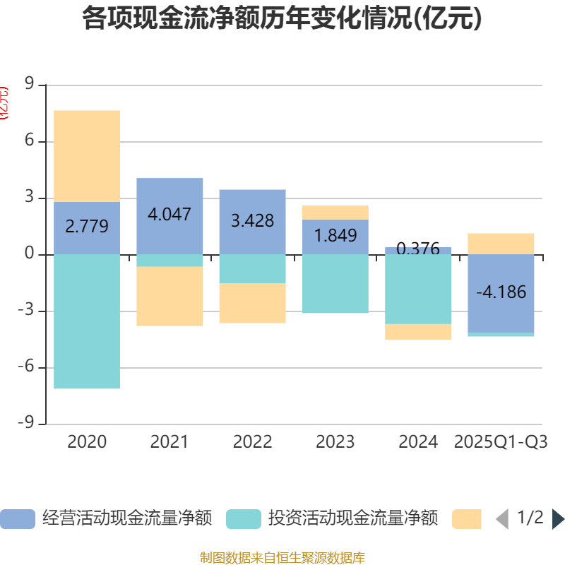 2025年前三季度,公司经营活动现金流净额为-4.19亿元,同比增加1.11亿元;筹资活动现金流净额1.11亿元,同比减少1.16亿元;投资活动现金流净额-1777.66万元,上年同期为-2.62亿元。