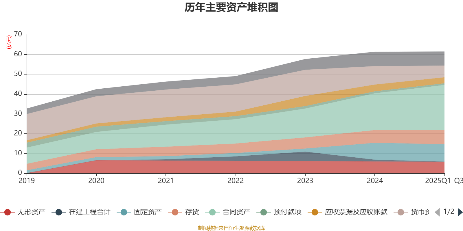 资产重大变化方面,截至2025年三季度末,公司合同资产较上年末增加22.49%,占公司总资产比重上升6.73个百分点;货币资金较上年末减少36.25%,占公司总资产比重下降5.52个百分点;在建工程合计较上年末减少98.5%,占公司总资产比重下降1.42个百分点;存货较上年末增加11.26%,占公司总资产比重上升1.16个百分点。