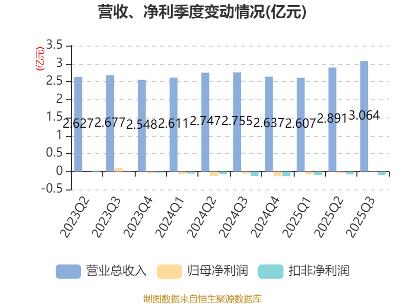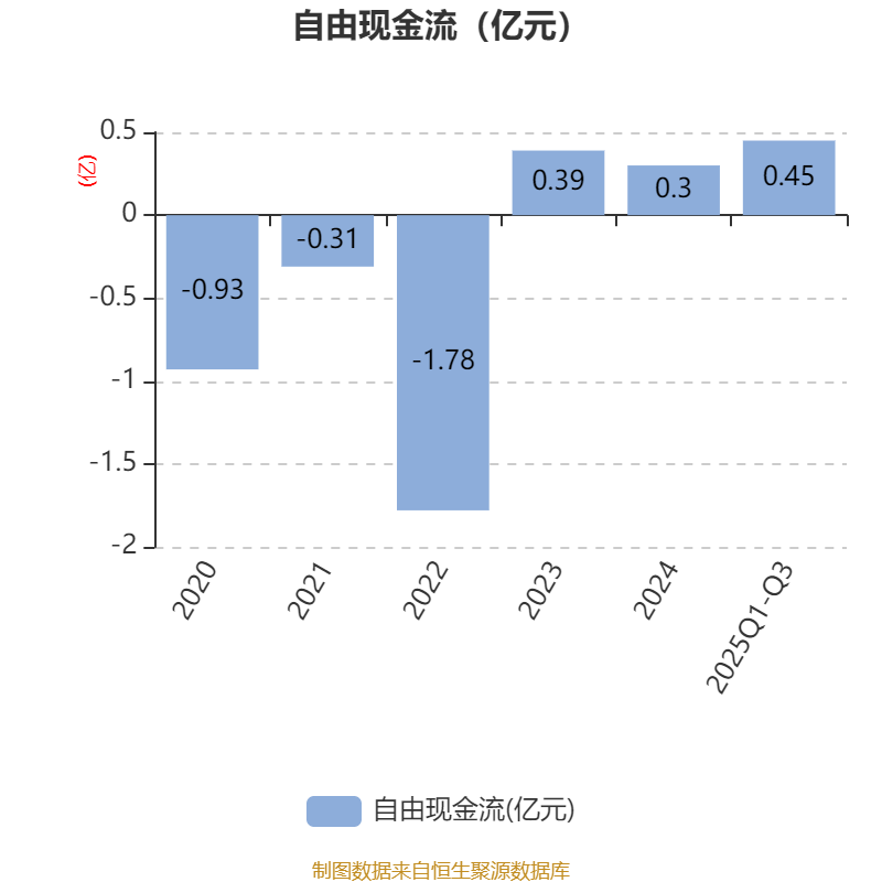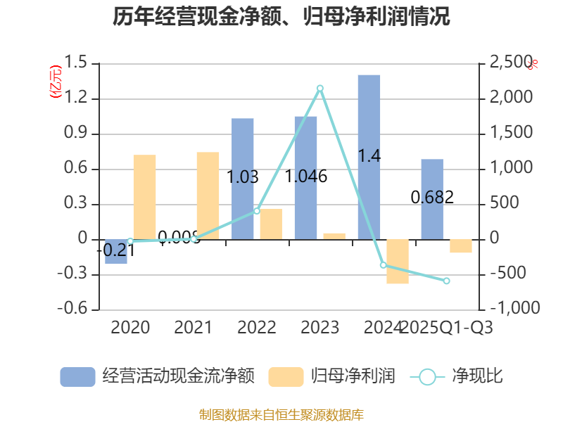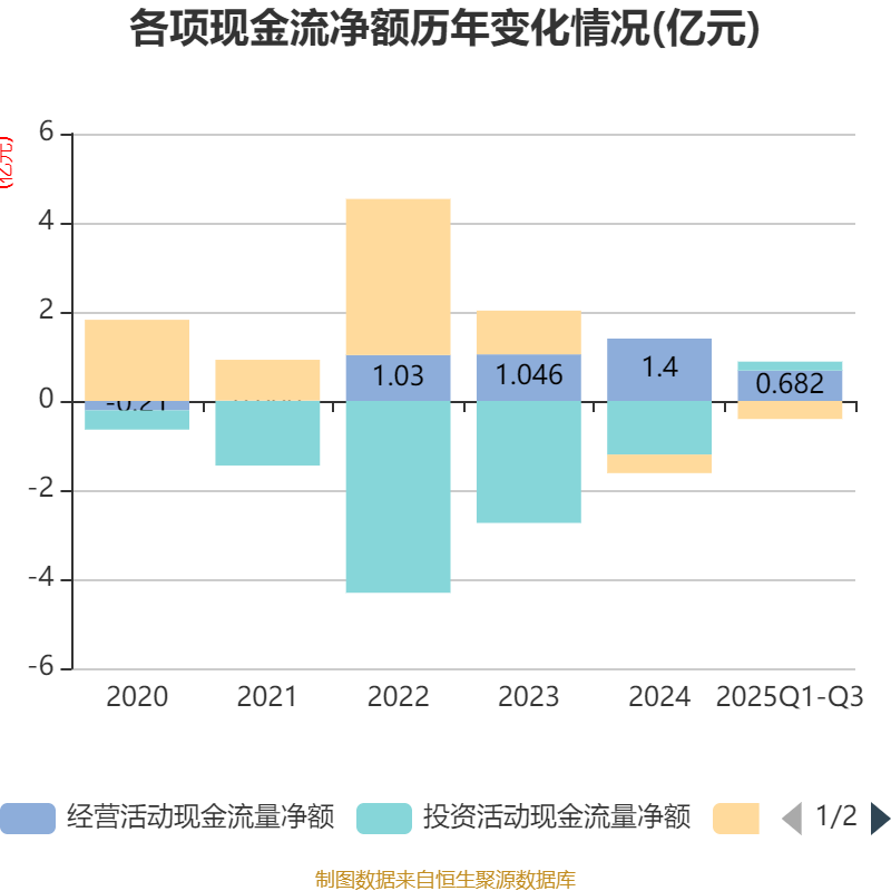 2025年前三季度,公司经营活动现金流净额为6818.57万元,同比下降44.8%;筹资活动现金流净额-4046.36万元,同比减少3482.37万元;投资活动现金流净额2006.65万元,上年同期为-1亿元。