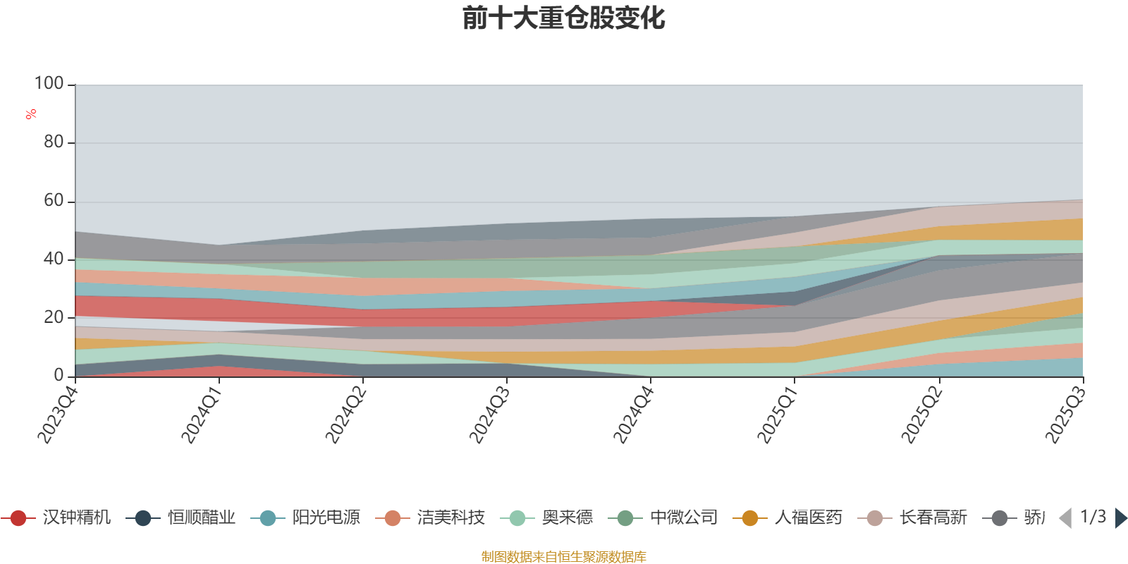 截至2025年三季度末,基金十大重仓股分别是骄成超声、新产业、阳光电源、晶方科技、人福医药、洁美科技、奥来德、中微公司、长春高新、恒生电子。