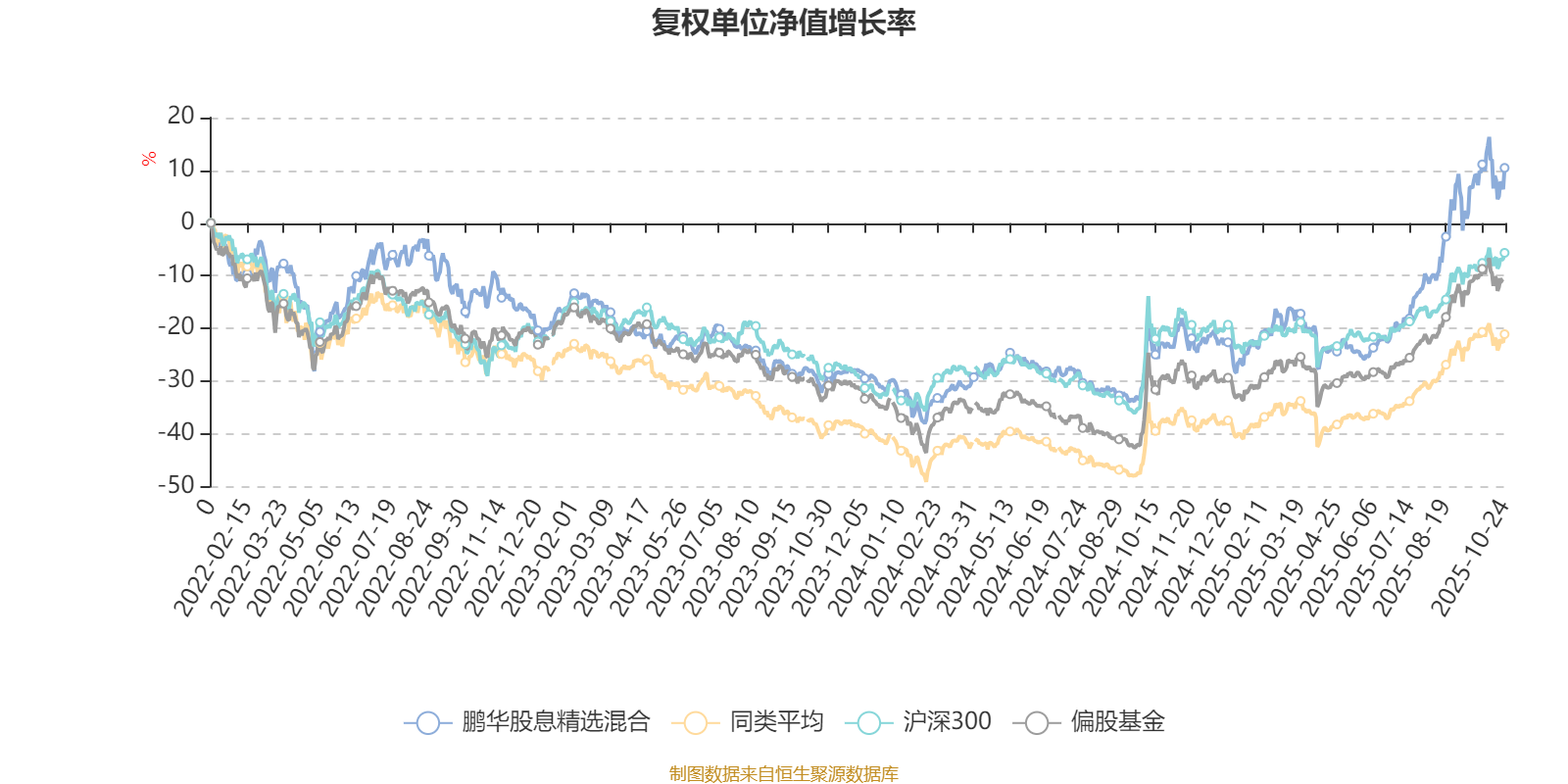 截至10月24日,鹏华股息精选混合近三个月复权单位净值增长率为26.29%,位于同类可比基金109/689;近半年复权单位净值增长率为45.11%,位于同类可比基金94/688;近一年复权单位净值增长率为44.75%,位于同类可比基金107/653;近三年复权单位净值增长率为28.15%,位于同类可比基金82/363。