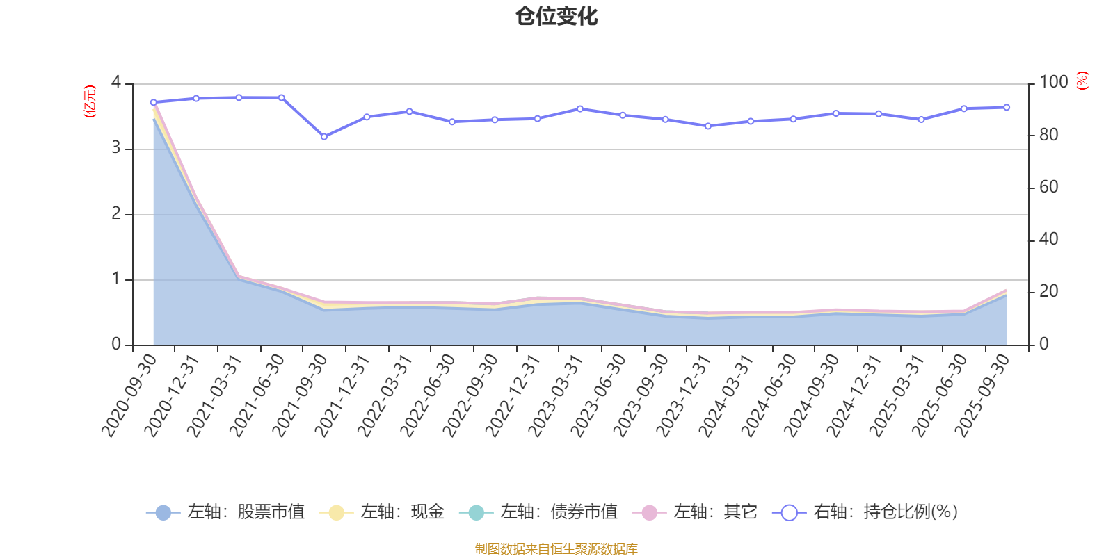 据定期报告数据统计,近三年平均股票仓位为87.58%,同类平均为83.44%。2021年一季度末基金达到94.6%的最高仓位,2021年三季度末最低,为79.65%。