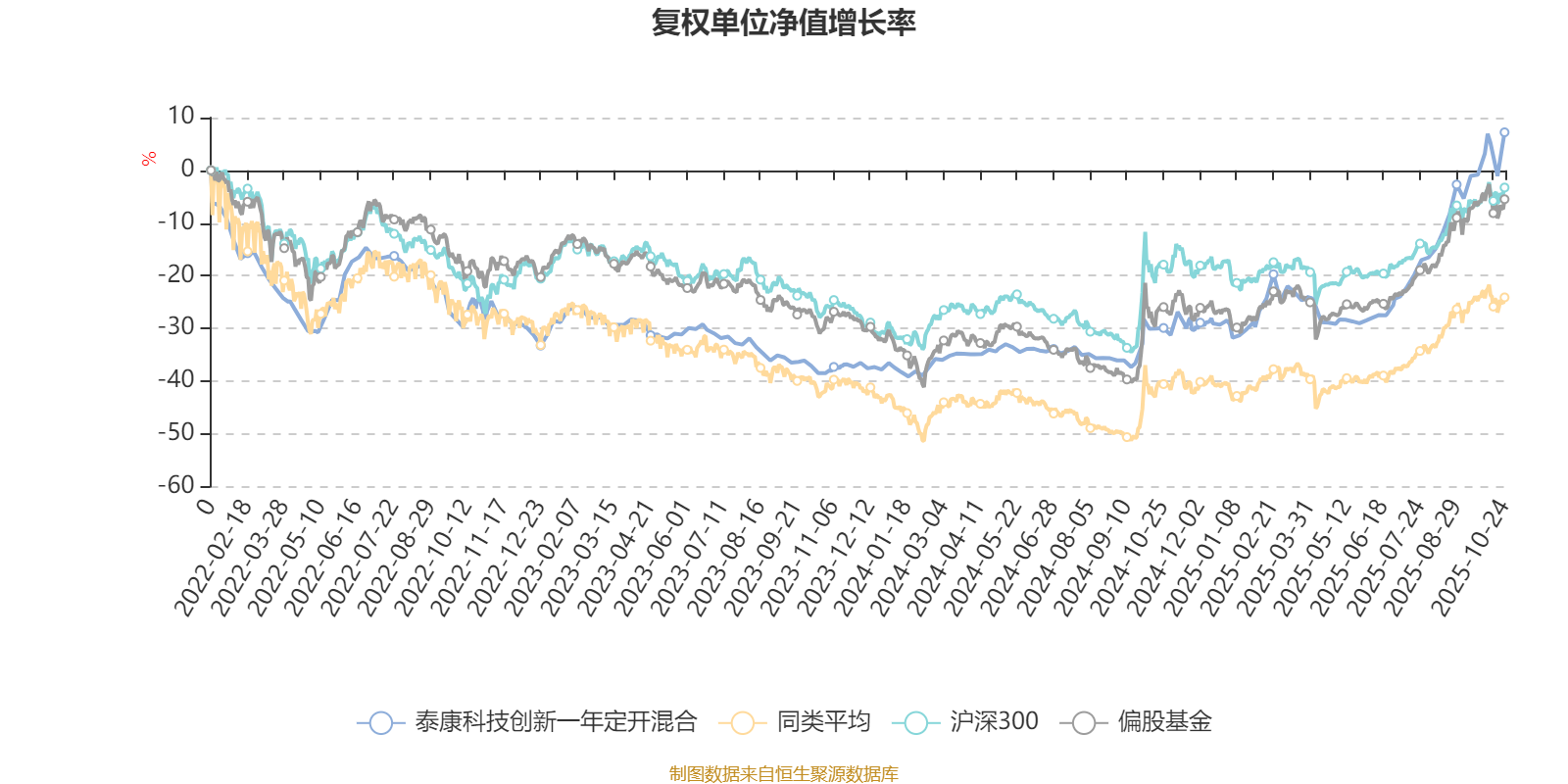 截至10月24日,泰康科技创新一年定开混合近三个月复权单位净值增长率为33.64%,位于同类可比基金55/621;近半年复权单位净值增长率为50.83%,位于同类可比基金66/618;近一年复权单位净值增长率为53.21%,位于同类可比基金81/611;近三年复权单位净值增长率为42.56%,位于同类可比基金90/518。