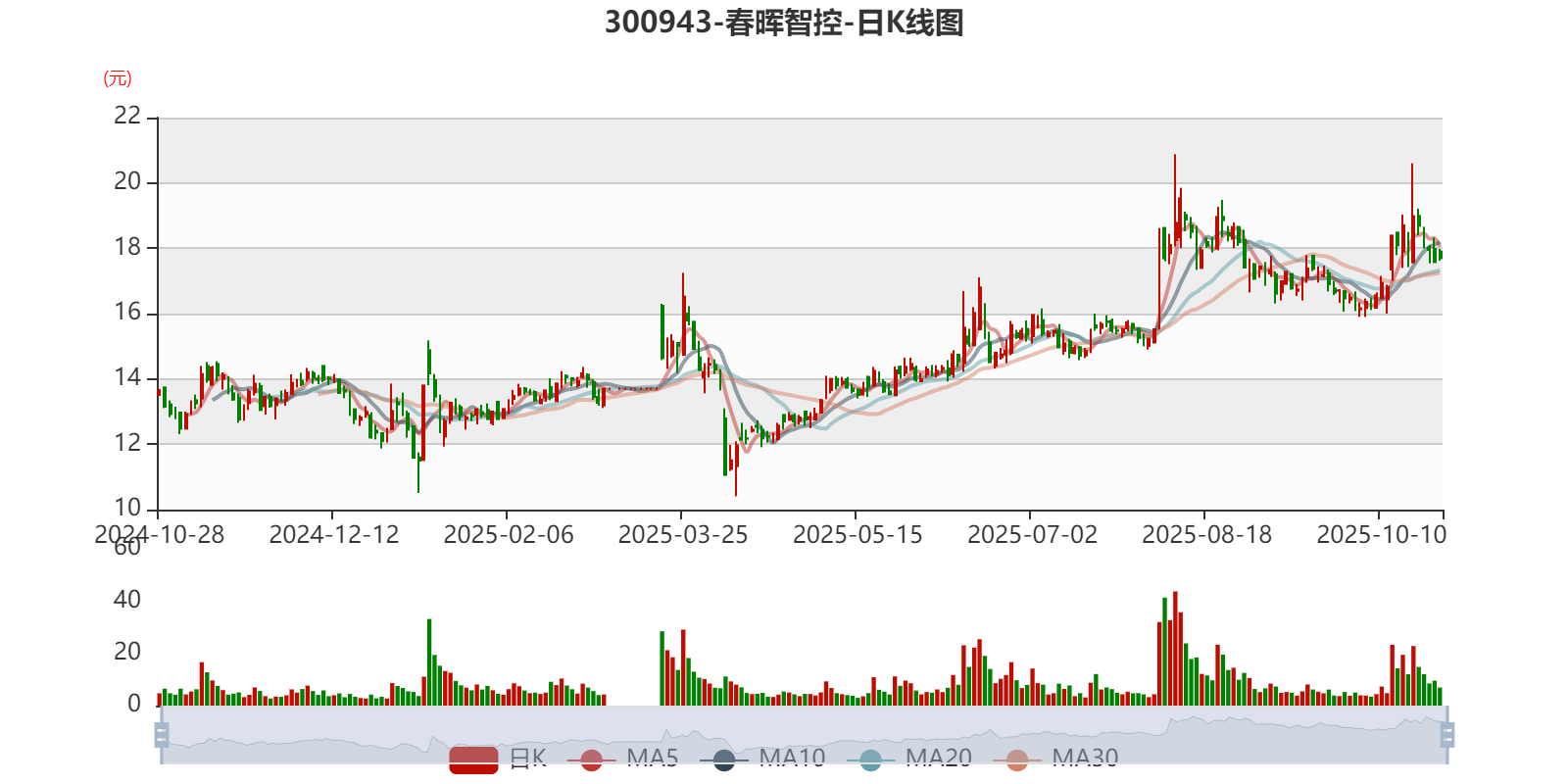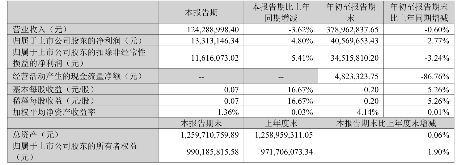 中证智能财讯春晖智控(300943)10月28日披露2025年第三季度报告。前三季度公司实现营业总收入3.79亿元,同比下降0.60%;归母净利润4056.97万元,同比增长2.77%;扣非净利润3451.58万元,同比下降3.24%;经营活动产生的现金流量净额为482.33万元,同比下降86.76%;报告期内,春晖智控基本每股收益为0.2元,加权平均净资产收益率为4.14%。
