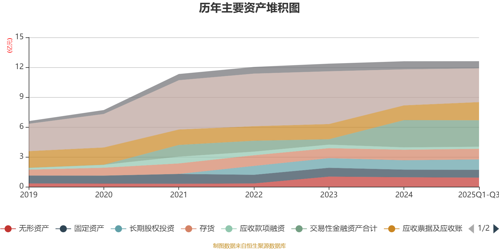 资产重大变化方面,截至2025年三季度末,公司应收票据及应收账款较上年末增加23.35%,占公司总资产比重上升2.73个百分点;货币资金较上年末减少6.59%,占公司总资产比重下降1.91个百分点;长期股权投资较上年末增加10.38%,占公司总资产比重上升0.77个百分点;交易性金融资产合计较上年末减少2.95%,占公司总资产比重下降0.65个百分点。