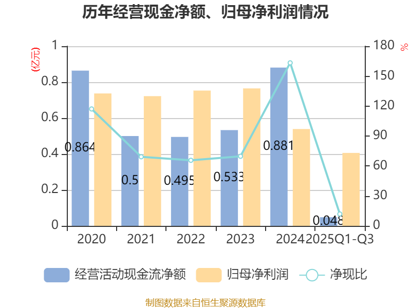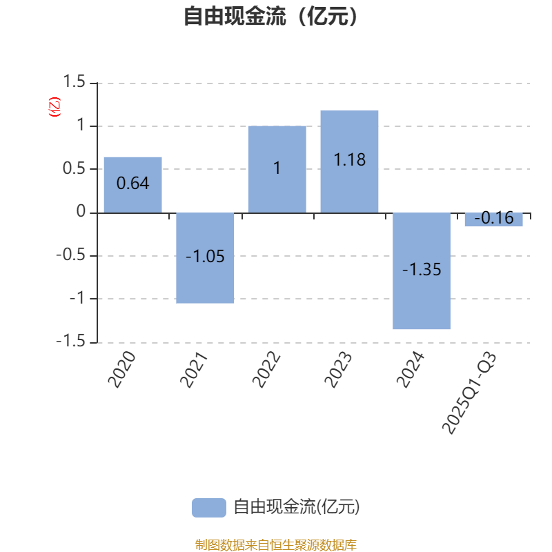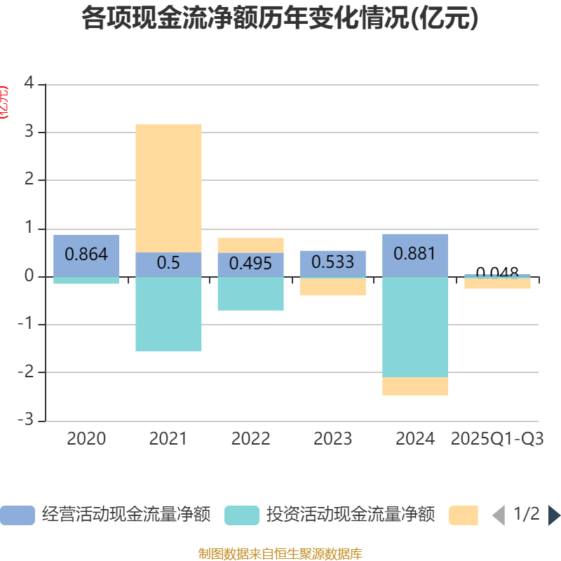 2025年前三季度,公司经营活动现金流净额为482.33万元,同比下降86.76%;筹资活动现金流净额-2069.41万元,同比增加1527.55万元;投资活动现金流净额-435.58万元,上年同期为-1.52亿元。