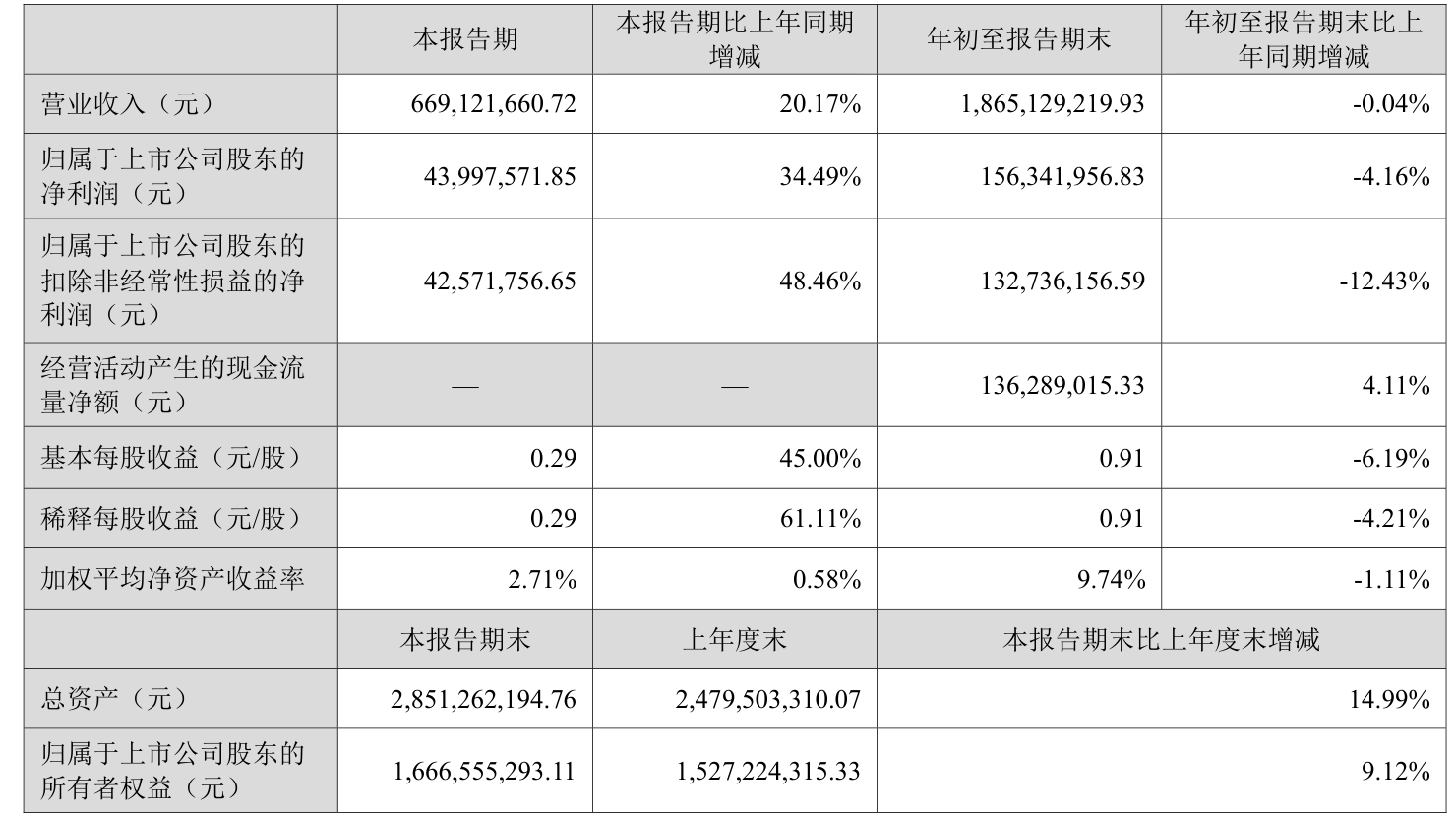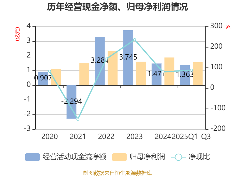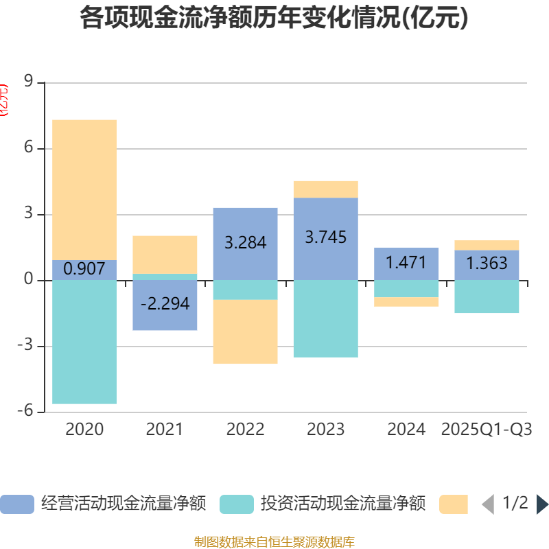 2025年前三季度,公司经营活动现金流净额为1.36亿元,同比增长4.11%;筹资活动现金流净额4448.41万元,同比增加9426.58万元;投资活动现金流净额-1.5亿元,上年同期为-8866.22万元。