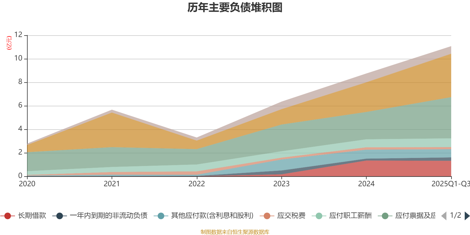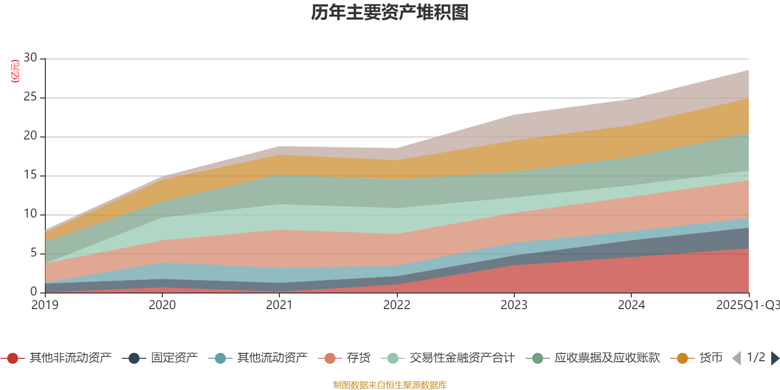 资产重大变化方面,截至2025年三季度末,公司一年内到期的非流动资产较上年末增加335.3%,占公司总资产比重上升3.63个百分点;应收票据及应收账款较上年末增加33.96%,占公司总资产比重上升2.42个百分点;其他非流动金融资产较上年末减少72.28%,占公司总资产比重下降2.26个百分点;交易性金融资产合计较上年末减少17.44%,占公司总资产比重下降1.67个百分点。