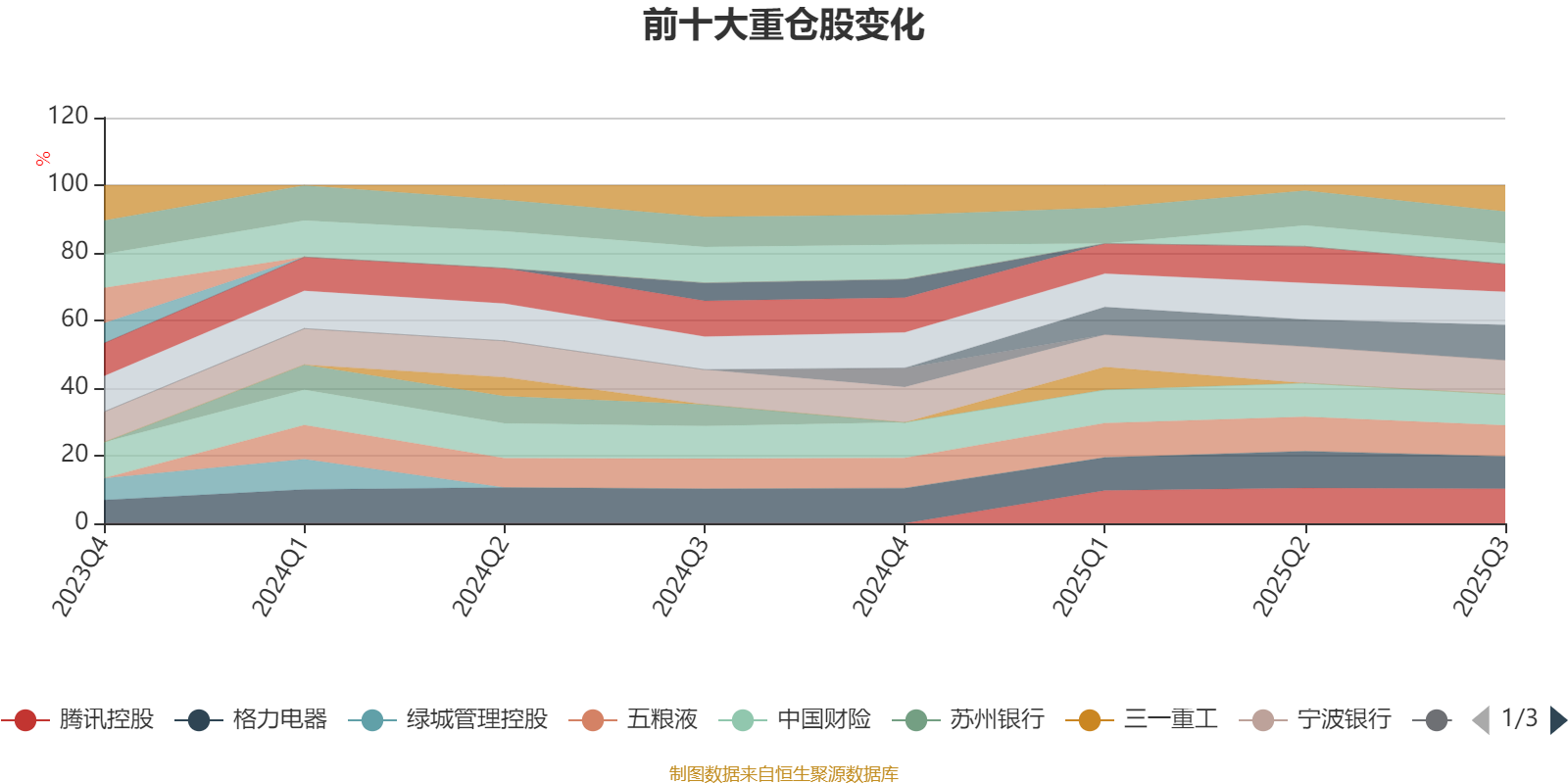 该基金持股集中度较高,近2年前十大重仓股集中度长期超过60%。截至2025年三季度末,基金十大重仓股分别是阿里巴巴-W、腾讯控股、宁波银行、招商银行、格力电器、贵州茅台、五粮液、中国财险、中国太保、中国平安。