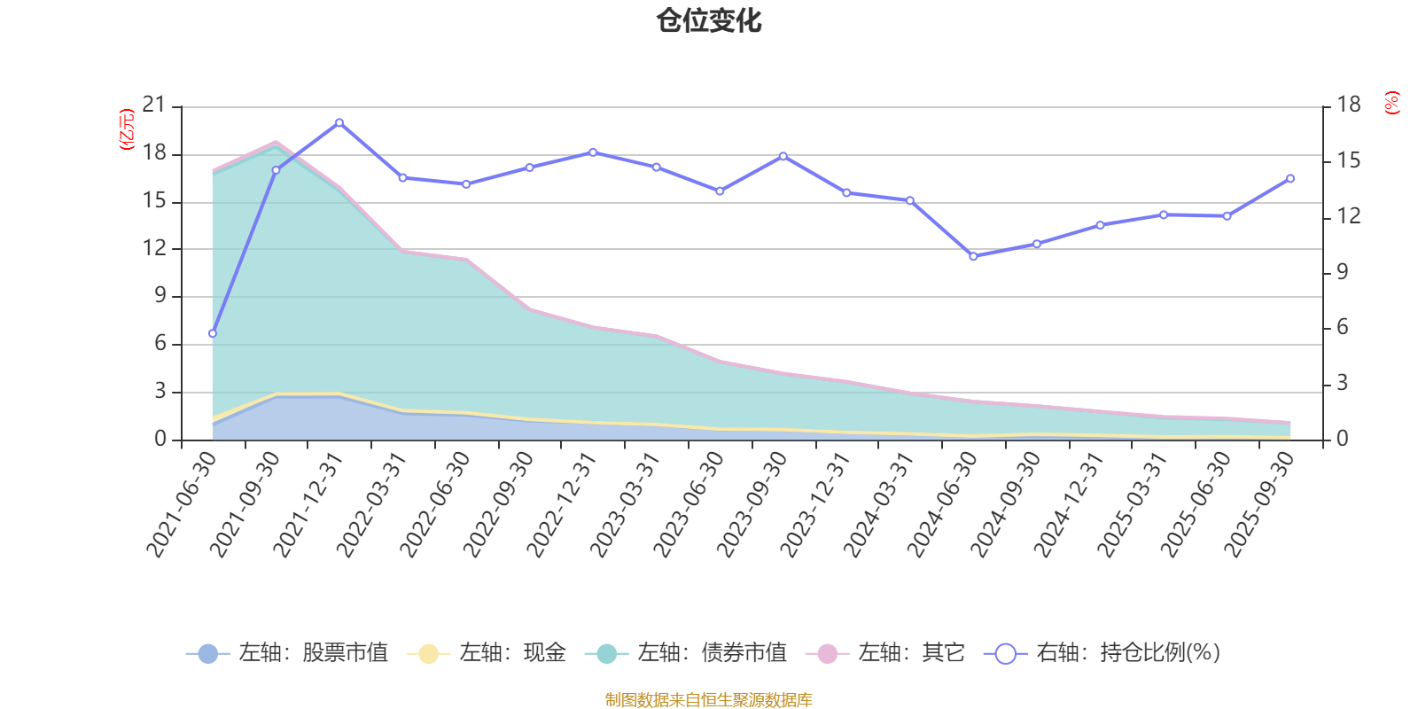 据定期报告数据统计,近三年平均股票仓位为12.97%,同类平均为19.03%。2021年末基金达到17.12%的最高仓位,2021年上半年末最低,为5.75%。