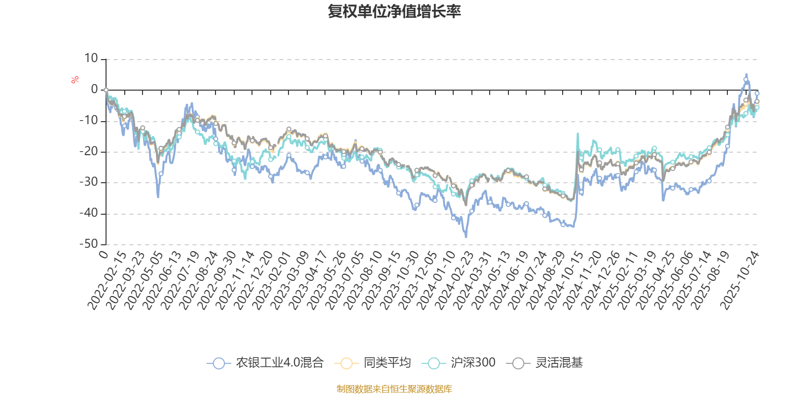 截至10月24日,农银工业4.0混合近三个月复权单位净值增长率为35.77%,位于同类可比基金115/1287;近半年复权单位净值增长率为45.24%,位于同类可比基金177/1287;近一年复权单位净值增长率为40.33%,位于同类可比基金251/1287;近三年复权单位净值增长率为28.40%,位于同类可比基金341/1286。