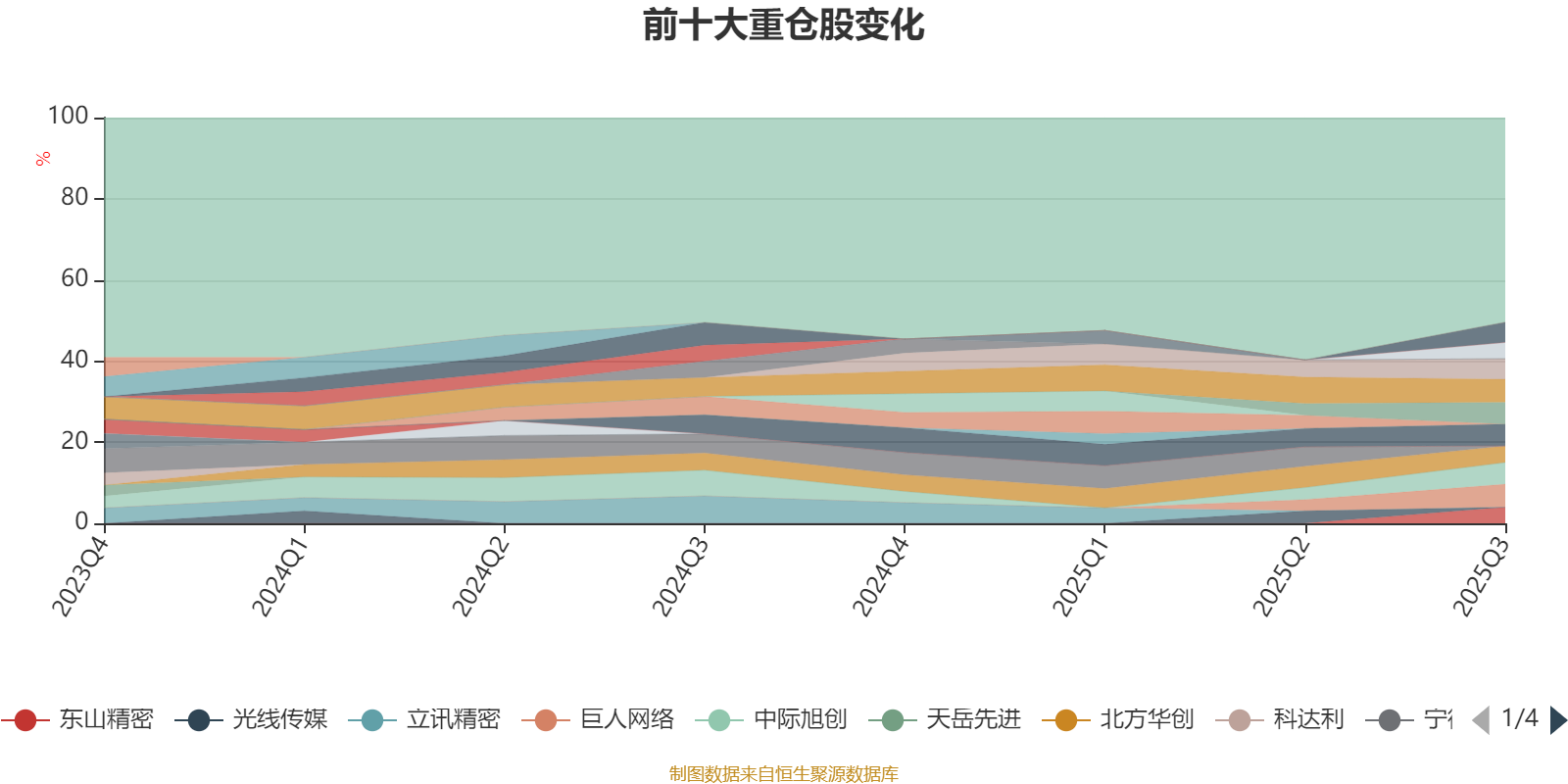 截至2025年三季度末,基金十大重仓股分别是恺英网络、巨人网络、寒武纪、吉比特、中际旭创、中芯国际、新易盛、北方华创、工业富联、东山精密。