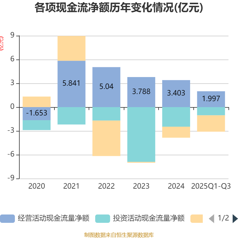 2025年前三季度,公司经营活动现金流净额为2亿元,同比增长10.77%;筹资活动现金流净额-2.06亿元,同比减少7484.52万元;投资活动现金流净额-1.04亿元,上年同期为-1.29亿元。