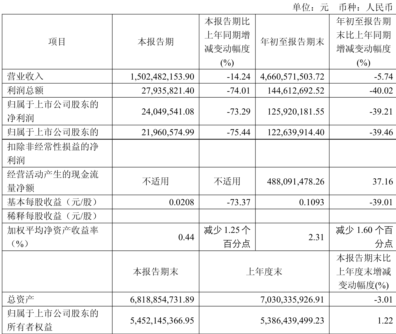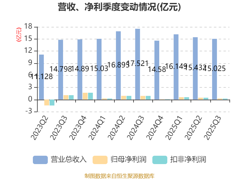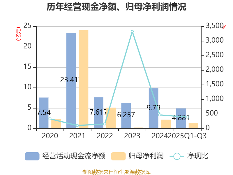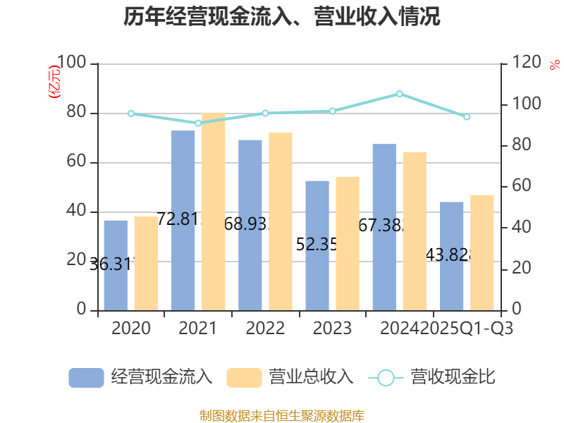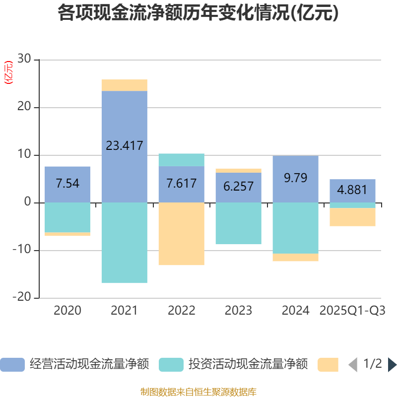 2025年前三季度,公司经营活动现金流净额为4.88亿元,同比增长37.16%;筹资活动现金流净额-3.79亿元,同比减少7409.91万元;投资活动现金流净额-1.18亿元,上年同期为-3.47亿元。